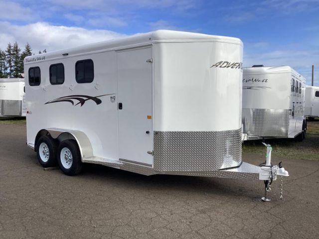 | The Adventure MX is our best seller. It is the best priced steel framed aluminum skinned trailer in the industry, having the perfect combination of style, user friendly features and value. This trailer has our newly designed aerodynamic front, head side drop down feed windows, tail side sliding windows and rubber wall mats all the way around the horse compartment making it the best equipped trailer in its class. UPGRADED FEATURES: Convenience Package Convenience Package includes: swing-out saddle rack, spare tire, water tank, door mounted tack organizer, sport bag, load light by each side and rear gate Rubber Floor mats in Tack room Star Caps Rear Door Windows Standard Features: 6 9 Wide, 70 Tall Triple Wall Construction Aluminum Exterior Sheets 1 Piece Aluminum Roof Torsion Axles 4 Wheel Electric Brakes Easy Lube Hubs Radial Tires Aluminum Fenders, Tread Brite Tapered Steps Front Gravel Guard Drop Down Feed Windows Windows Tail Side Rubber Bumper Molded Seven-Way RV Plug One Year Limited Warranty Tack Room Features: 32 Inch Inset Tack Door Dome Light Tack Door Brush Tray Three Place Saddle Racks 16 Bridle Hooks Blanket Rod Clothes Rod Camper Vent Horse Compartment Features: Drop Down Feed Windows head side Sliding Windows tail side Dome Light Rubber Wall Mats Rubber Floor Mats Slam Latch Dividers Tie Ring Each Stall Double Rear Doors Paint Finish Features: Acidic Phosphatizing Wash Polymer Coating Epoxy Primer Polyurethane Paint Infrared Cured Descriptions Subject to Error For more information on this trailer please contact Double J Trailers at 541-812-1234. Thank You! Financing available to qualified buyers! All trailer prices are cash prices. Thank you! Trades Welcome Two Lots To Better Serve You! Woodland Washington & Albany Oregon We have over 250 trailers in stock. Please view our entire inventory at www.double-j.comhttp://www.double-j.com/ thank you! Double J imposes a surcharge of 3% on credit card purchases of amounts greater than $500 |