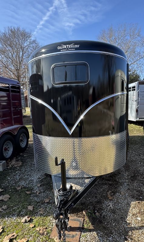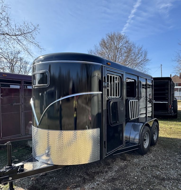 | New 2 horse trailer, 6 x 6'6" x 13, 2820 lbs., Swing wall dressing room with window in dressing room door, dome lights, torflex axles, 16-in 10-ply tires, slam latch on divider, drop-down windows, low profile roof, 2 saddle racks, rubber on both walls, mats, including dressing room, spare tire.