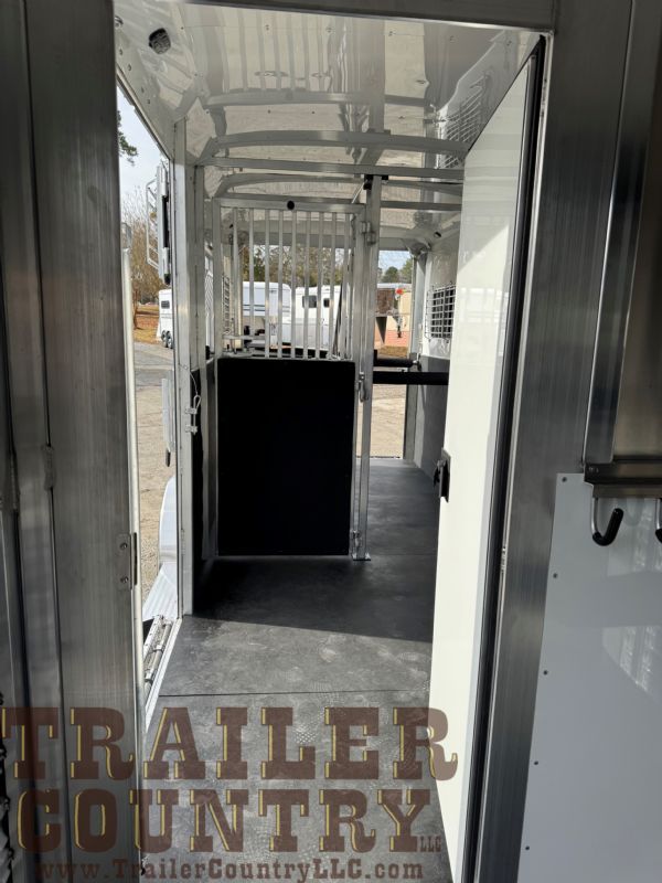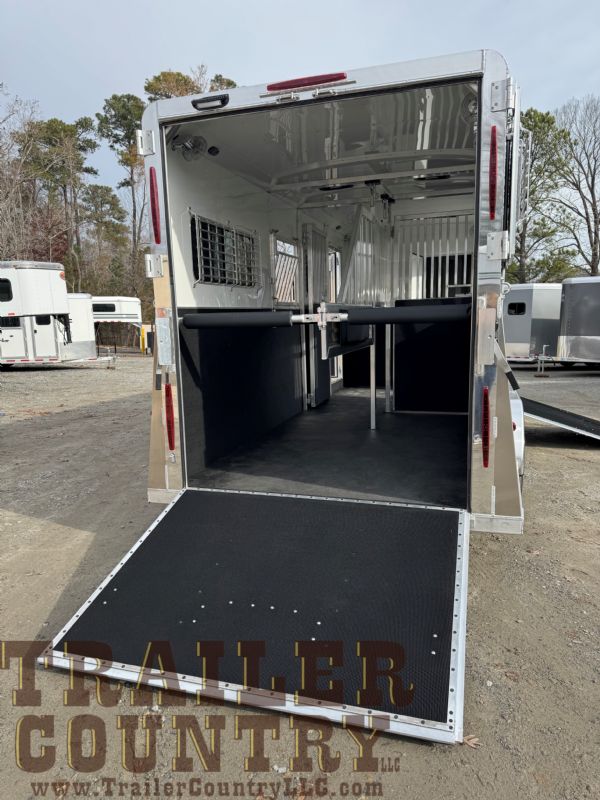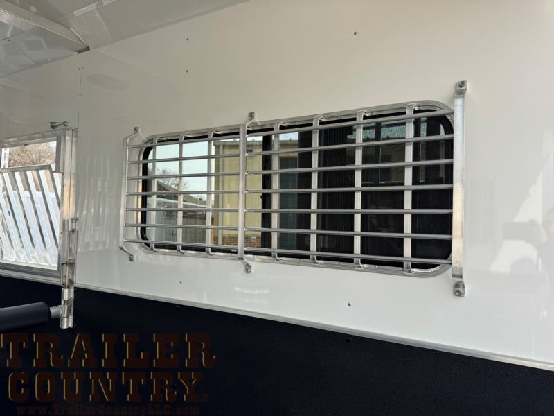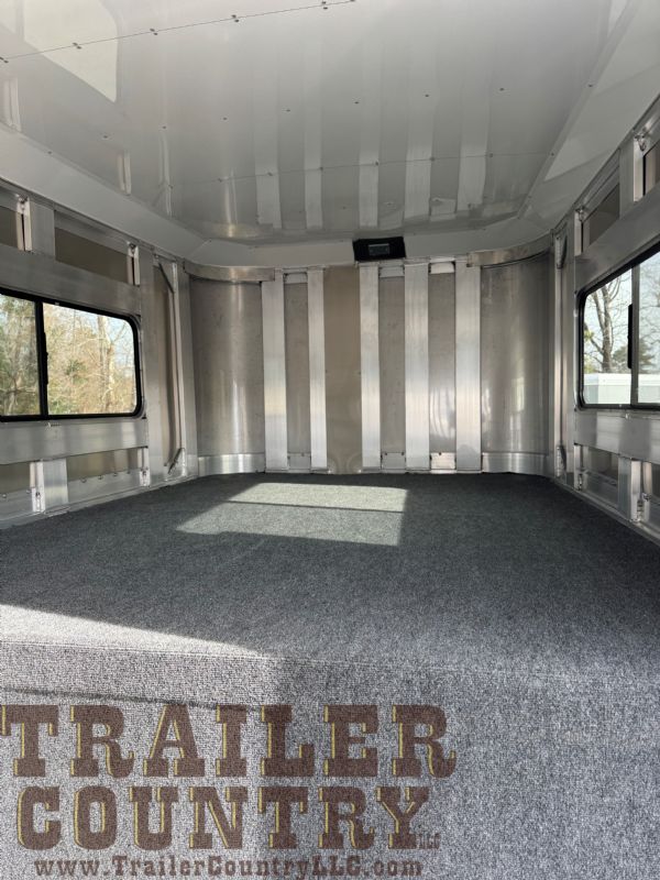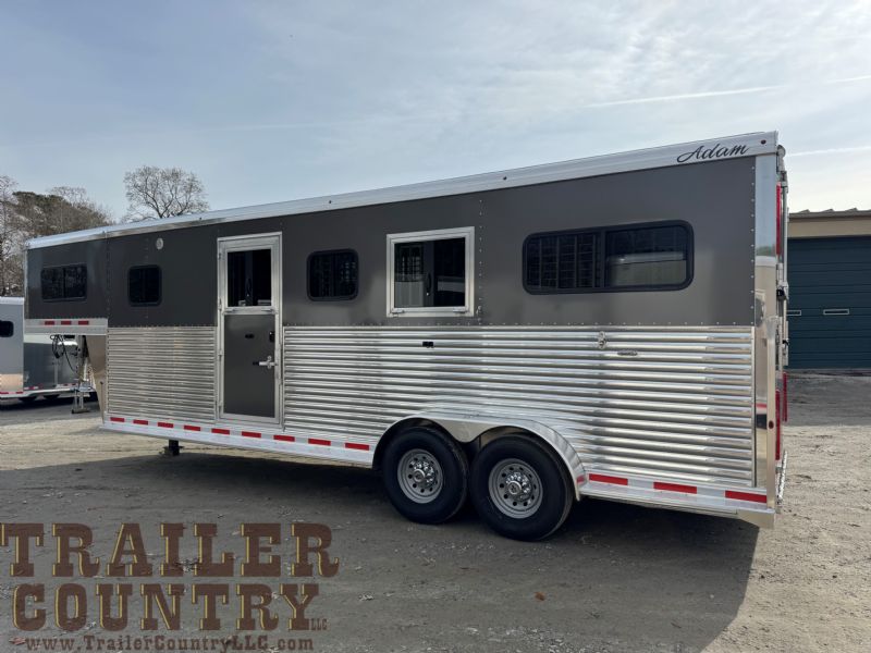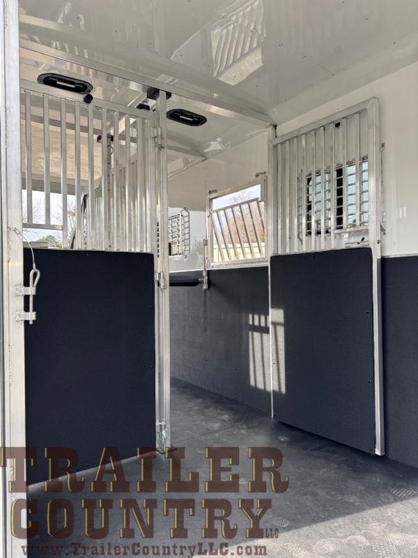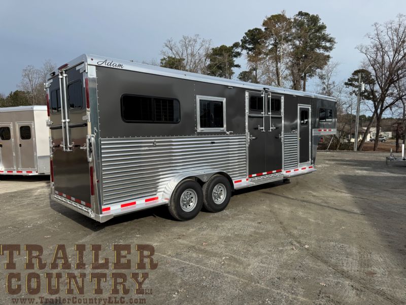 2026 Adam 2+1 8 tall, Large Box, Large Dress $52,175 Stock # TC8026 Video Link: https://youtu.be/KfV_2iiXjWA?si=0rGRXQK7aC_OtyXW CHARCOAL colored skin 8 tall, 7 wide, 24 floor length 5 dress and 19 horse area 9 box stall all aluminum 7000# Dexter torsion axles stud doors at straight horse heads drop head windows on straight horses drop head window in full size escape door 60 side ramp with top curtains with sliding windows rear ramp with top curtains with sliding windows INSULATED ceiling throughout walk through door from horse area to dressing room four 12v fans in horse area polished extrusion and top rail heavy duty window bars on large horse area sliders manual jack hydraulic can be added for additional cost upgraded Dalton door on dressing room padded divider padded breast/butt bars all dividers are removable LED interior lights, LED load lights, LED running lights spare tire mounted under nose 5 dresser includes bridle hooks, 3 saddle racks, mats on dresser floor, carpet in nose and on drop sheet, sliding windows in nose, walk through door from horse area to dressing room www.trailercountryllc.com info@trailercountryllc.com 757-646-7315 call or text 757-630-8664 Financing Available. Delivery Available. VA Dealer # 39905 |