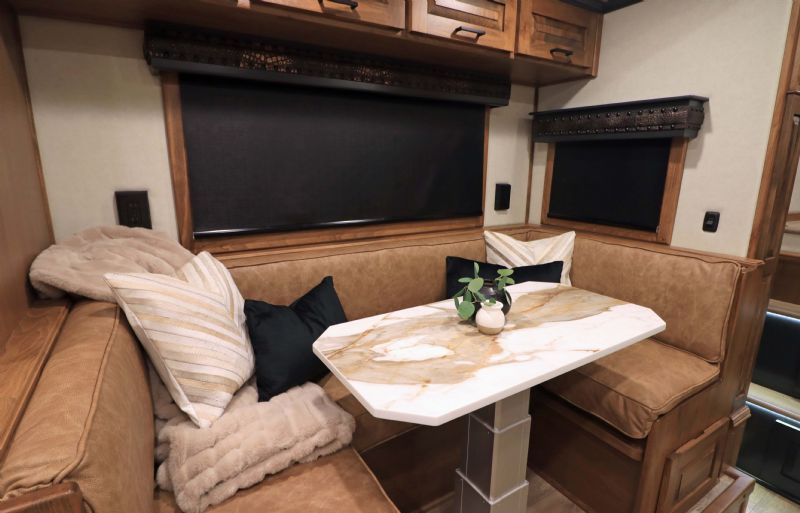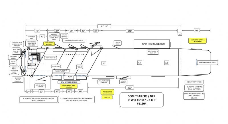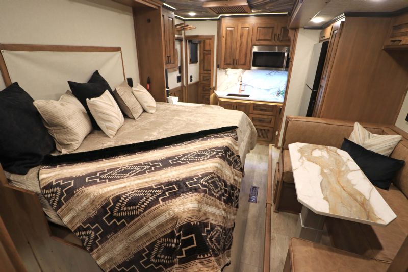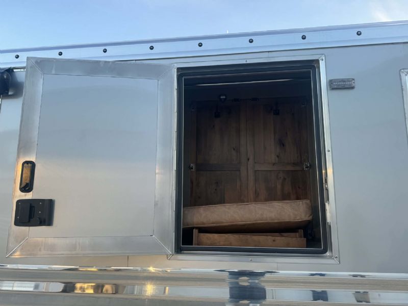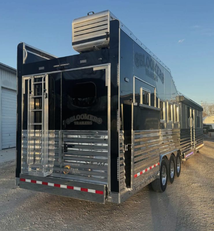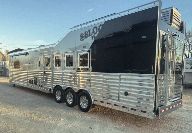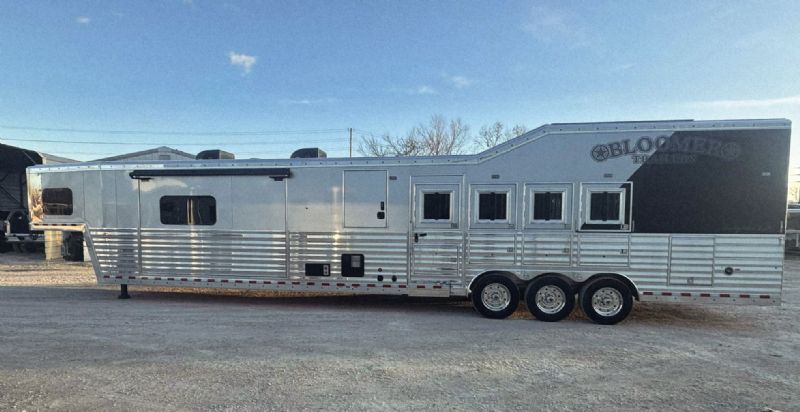 | NFR 2025 Bloomer Showcase trailer! 2026 Bloomer 4+1 with 20'6'' Trail Boss Conversion. Trailer Features: Silver skin with newly released side slat extrusion, 41'11 floor, 8' tall, 8' wide, Triple 8500# Dexter Air Ride axles with hydraulic disk brakes, 10.5' hydraulic slide room, 19.5'' Alcoa wheels, 16 Ply Continental tires, Marker lights top and bottom rail every 12'', Undercarriage Boogie lights tied into brake and turn signals, 24'' XL Rear tack w/6 saddle racks/shelving/blanket racks/brush boxes, Rear compartment w/ Compressor and hose reel and pressurized hot/cold water lines, 60 gallon water tank in the integrated hay pod, Closed front with roll up door, Escape door with manger, WERM floor, Stud divider 1st gate, Fully lined and insulated, Drops front and back, Feed doors with gas struts, Exterior access door to closet, Keyless entry on all doors, Dexter monitoring system that displays tire pressure, tire temperatures, mileage on trailer to track service intervals, & GPS location.