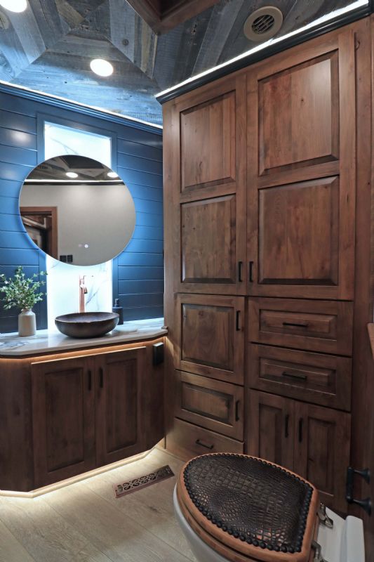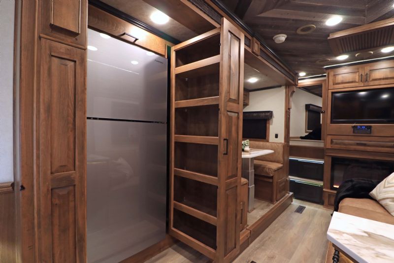Conversion Features: 20.5' Trail Boss Conversion, Sleeps 5-6 with pull down Murphy queen bed, 6.0 diesel generator, German Beechwood cabinets and moldings w/upgraded finish, Armless 20' box awning, 10 cu ft 12V fridge, Dual 15k AC units with heat pumps, 10 gallon water heater 110v or 12V/LP, Electric fireplace, Ducted floor heat with 25k furnace, Quartz tops & backsplash, Undermount copper sink, Backlit crown molding, Upgraded headboard, Upgraded slide trim moldings, Pull out pantry, LVP flooring, Upgraded diamond shiplap ceiling, Pull out dog bowls, Tilt out trash can, Storeaway induction cooktop, Pop up outlets and charge stations, Keurig coffee maker, Exterior LP disconnect line and Blackstone grill, Starlink prep port, Exterior coax outlet, Memory foam mattresses in GN and Murphy bed, Fold down sofa sleeper, Fold down U shaped dinette sleeper with table top that moves down with remote, Upgraded wood stair treads and GN flooring, Upgraded solid surface shower stall with seat/Herringbone tile/Residential shower head, Leather covered toilet seat, 60 gallon main fresh water tank under sofa, Upgraded 4.5'' ceiling lights, Upgraded 90 amp converter, Exterior courtesy lighting, Backlit recessed cutout on vanity wall, Round touch backlit vanity mirror, Upgraded insulation package & Extra gen switch in GN bed area. |