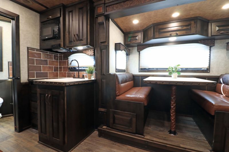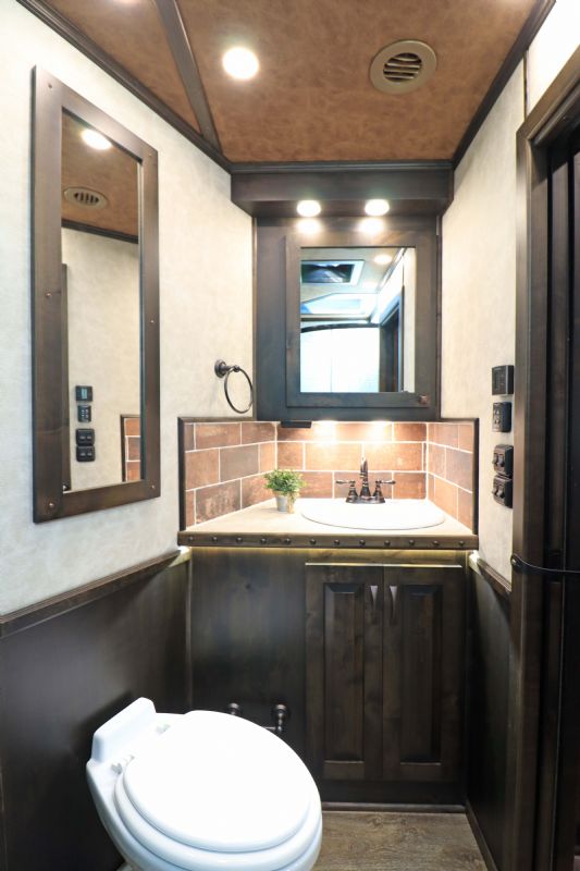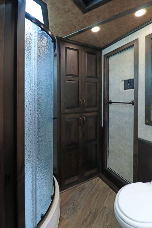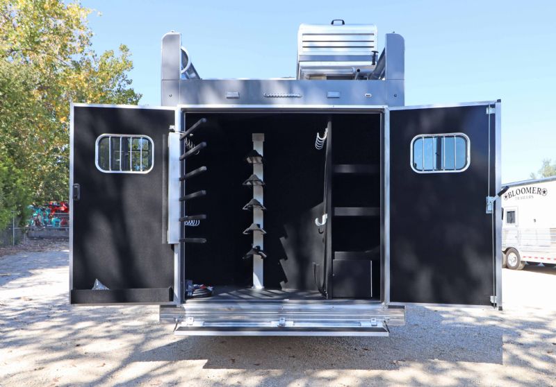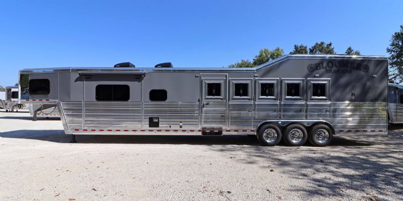 Model: 2026 Bloomer 5 Horse Overall Dimensions: 39'1'' L x 8' W x 7.5' H Configuration: 5+1 Horse Side Load FITS 6H Chassis: Triple HD 8k axles with hydraulic brakes for superior control and safety. Key Trailer Features: Wheels: 19.5'' Alcoa wheels paired with 18 Ply Continental tires for durability and smooth towing. Living Quarters: 15'9'' Trail Boss Conversion that comfortably sleeps 6, featuring a 78'' hydraulic slide-out Exterior: Charcoal skin, fully polished extruded sides, and a stainless steel front that offer both aesthetics and protection. Interior: Full back tack with a medicine cabinet, extensive shelving, and an integrated hay pod for optimal storage solutions. Luxury Living Quarters: Sofa and dinette convert to sleepers, alongside a fold-down bunk and a queen-sized mattress. Amenities: Equipped with an 5.5k Onan generator, dual hydraulic jacks, and a 18' electric awning with a protective shield. Kitchen and Bath: Features porcelain sinks, a stone backsplash, and a spacious bathroom with a marbled radius shower stall. Additional Features: Insulation: Fully insulated to maintain a comfortable interior climate regardless of external weather conditions. Accessibility: Features such as mangers, feed doorss, escape doors, and a walk-thru door into the LQ. Technology: 32 flat-screen TV with DVD, inside/outside speakers, and upgraded 4.5 interior lights to enhance your living experience. Measurements & Capacities: Length: 39'1'' Width: 8' Height: 7'6'' |