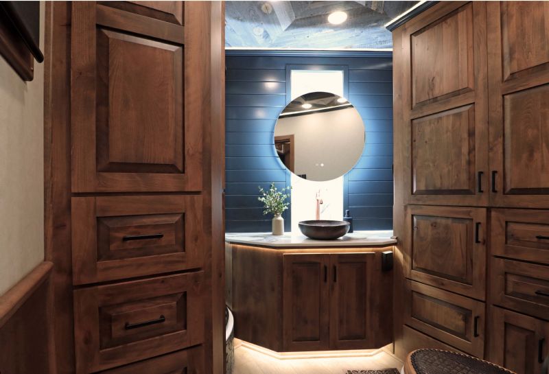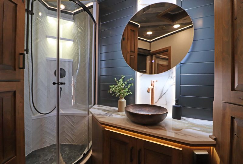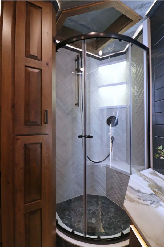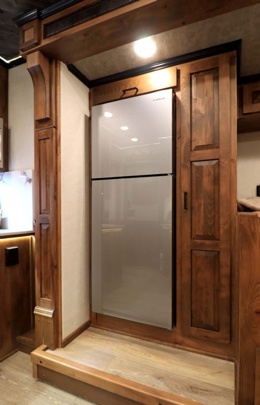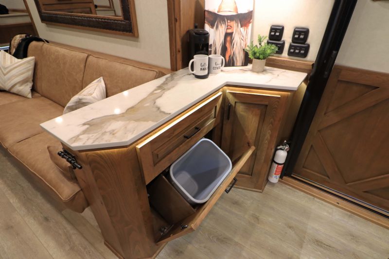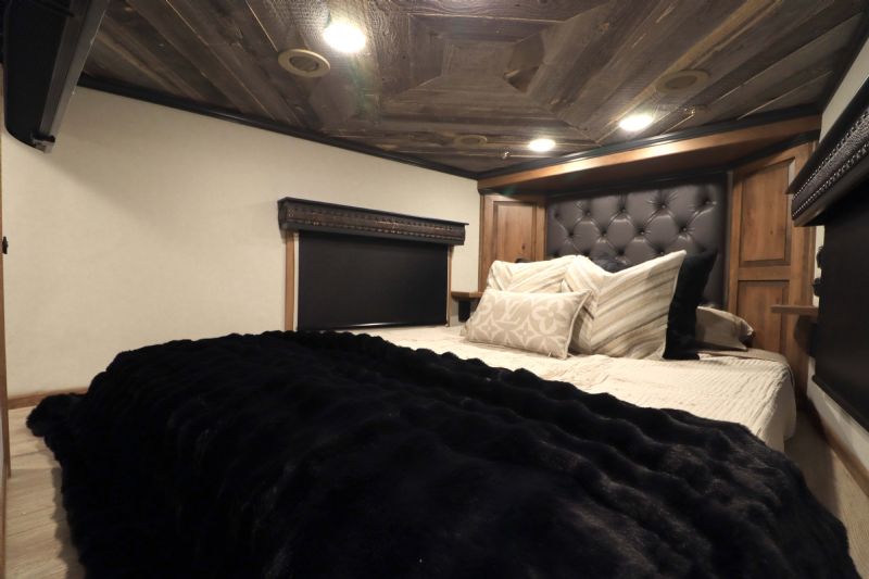 Conversion Features: 20.5' Trail Boss Conversion, Sleeps 5-6 with pull down Murphy queen bed, 6.0 diesel generator, German Beechwood cabinets and moldings w/upgraded finish, Armless 20' box awning, 10 cu ft 12V fridge, Dual 15k AC units with heat pumps, 10 gallon water heater 110v or 12V/LP, Electric fireplace, Ducted floor heat with 25k furnace, Quartz tops & backsplash, Undermount copper sink, Backlit crown molding, Upgraded headboard, Upgraded slide trim moldings, Pull out pantry, LVP flooring, Upgraded diamond shiplap ceiling, Pull out dog bowls, Tilt out trash can, Storeaway induction cooktop, Pop up outlets and charge stations, Keurig coffee maker, Exterior LP disconnect line and Blackstone grill, Starlink prep port, Exterior coax outlet, Memory foam mattresses in GN and Murphy bed, Fold down sofa sleeper, Fold down U shaped dinette sleeper with table top that moves down with remote, Upgraded wood stair treads and GN flooring, Upgraded solid surface shower stall with seat/Herringbone tile/Residential shower head, Leather covered toilet seat, 60 gallon main fresh water tank under sofa, Upgraded 4.5'' ceiling lights, Upgraded 90 amp converter, Exterior courtesy lighting, Backlit recessed cutout on vanity wall, Round touch backlit vanity mirror, Upgraded insulation package & Extra gen switch in GN bed area. |
