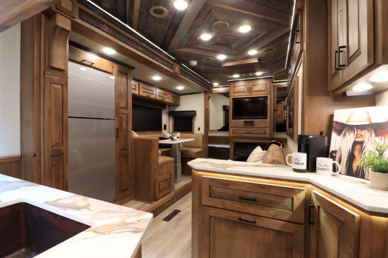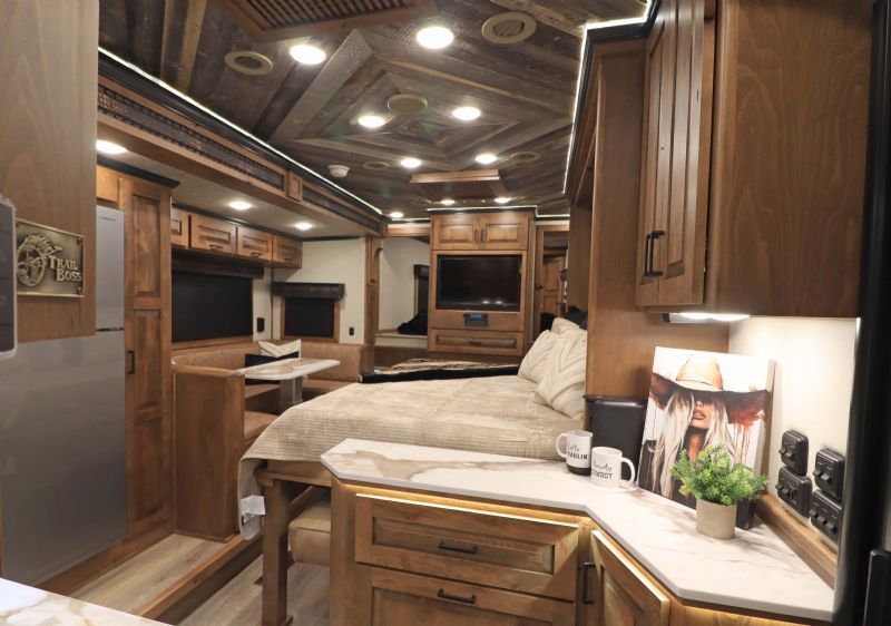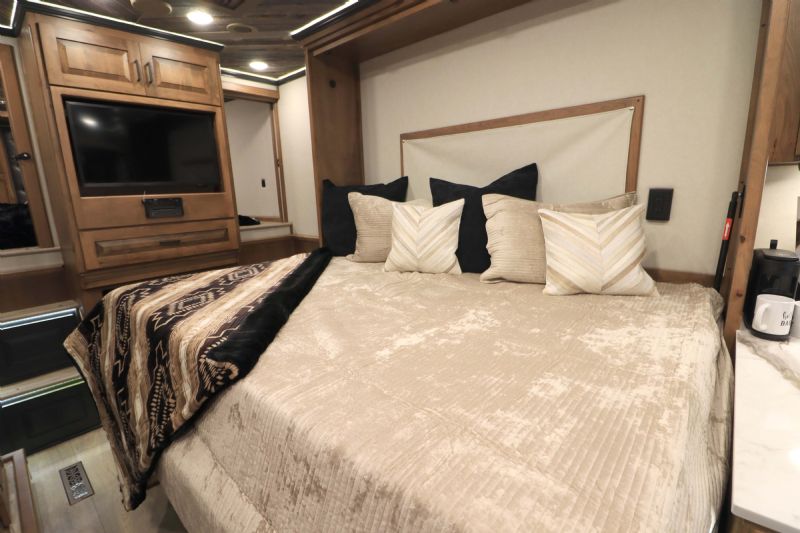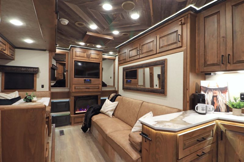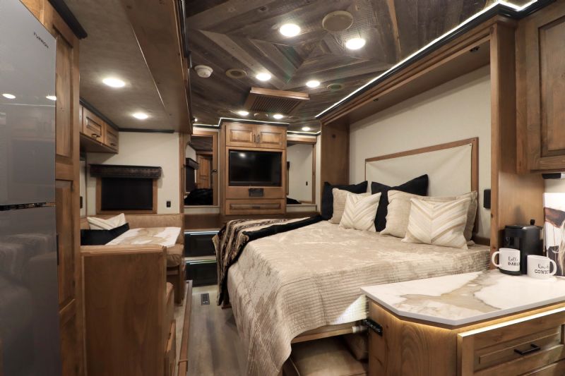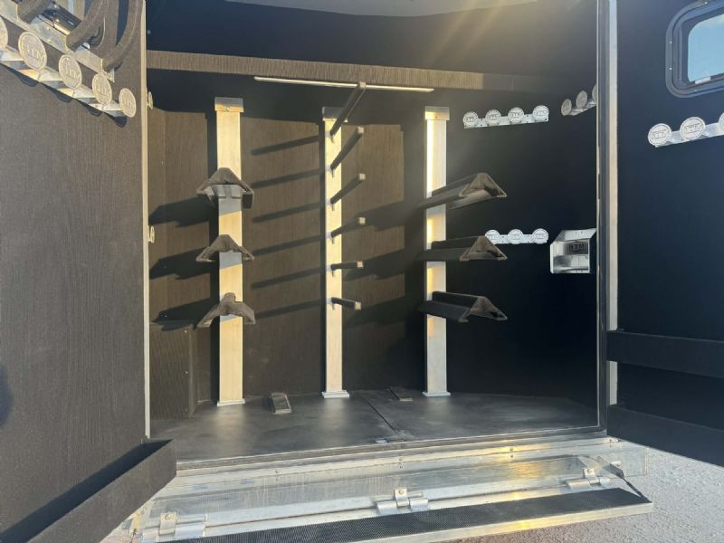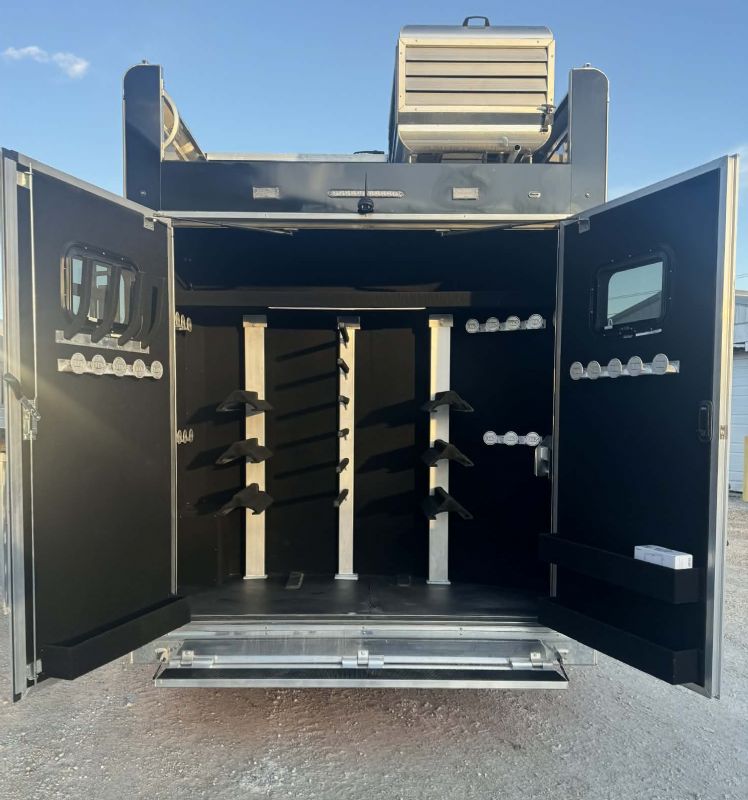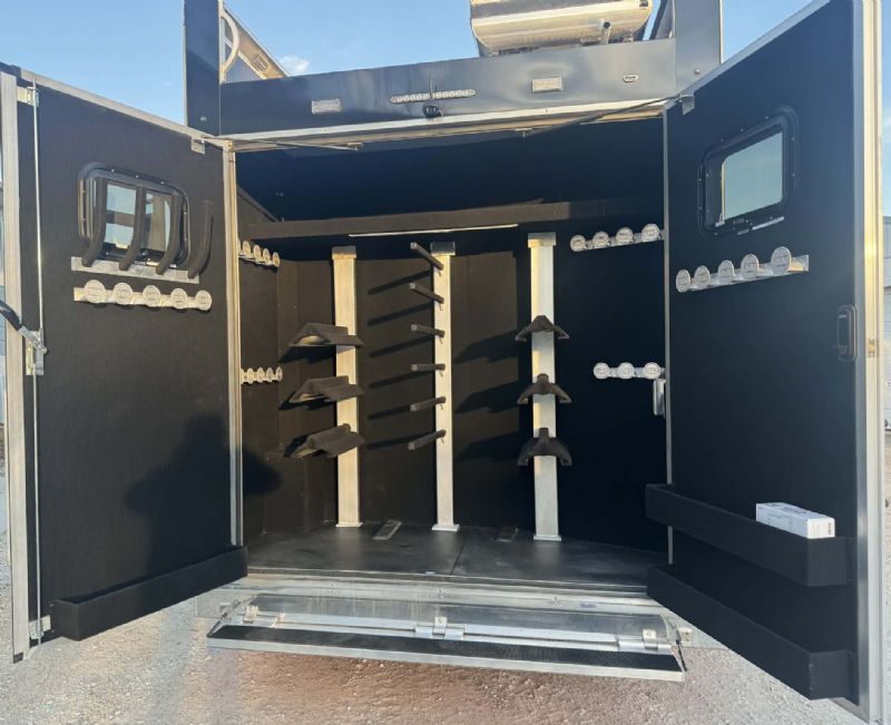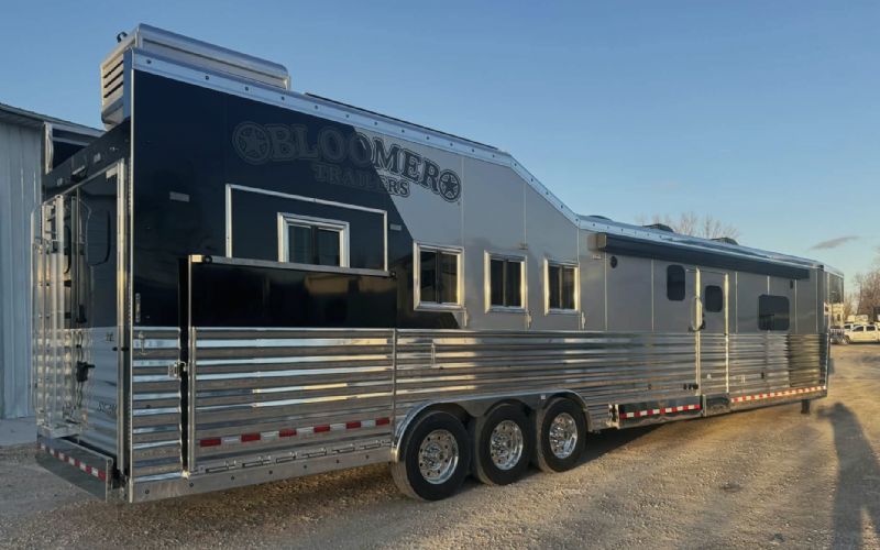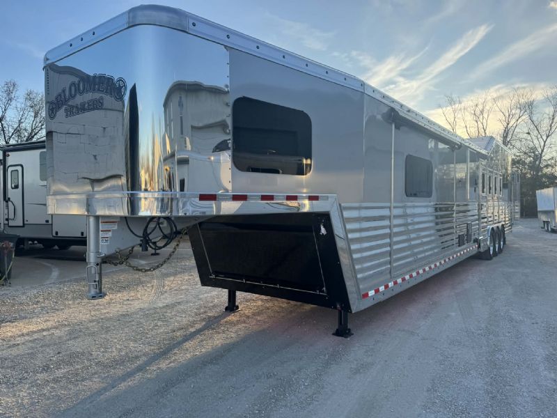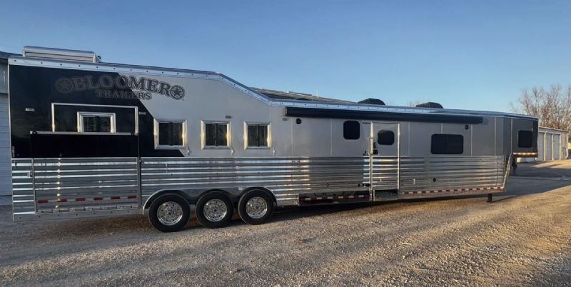 | NFR 2025 Bloomer Showcase trailer! 2026 Bloomer 4+1 with 20'6'' Trail Boss Conversion. Trailer Features: Silver skin with newly released side slat extrusion, 41'11 floor, 8' tall, 8' wide, Triple 8500# Dexter Air Ride axles with hydraulic disk brakes, 10.5' hydraulic slide room, 19.5'' Alcoa wheels, 16 Ply Continental tires, Marker lights top and bottom rail every 12'', Undercarriage Boogie lights tied into brake and turn signals, 24'' XL Rear tack w/6 saddle racks/shelving/blanket racks/brush boxes, Rear compartment w/ Compressor and hose reel and pressurized hot/cold water lines, 60 gallon water tank in the integrated hay pod, Closed front with roll up door, Escape door with manger, WERM floor, Stud divider 1st gate, Fully lined and insulated, Drops front and back, Feed doors with gas struts, Exterior access door to closet, Keyless entry on all doors, Dexter monitoring system that displays tire pressure, tire temperatures, mileage on trailer to track service intervals, & GPS location.