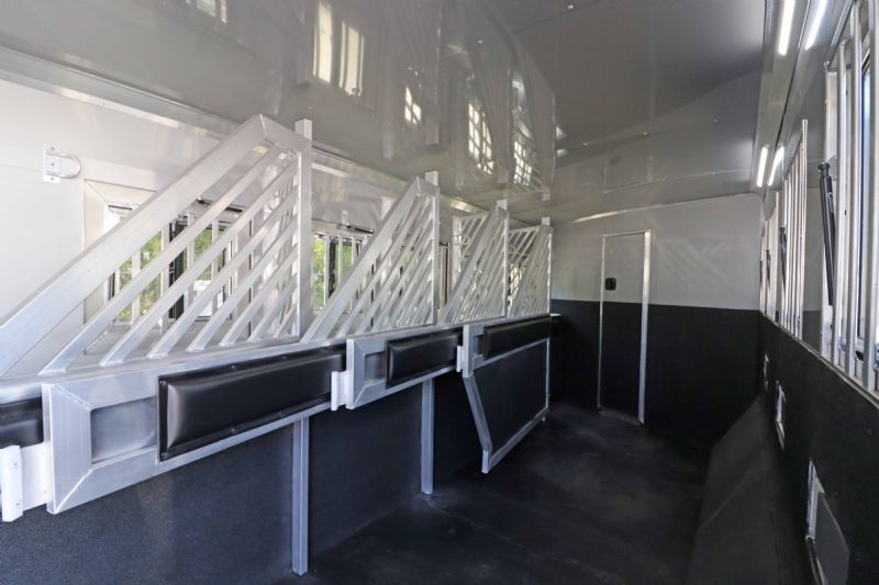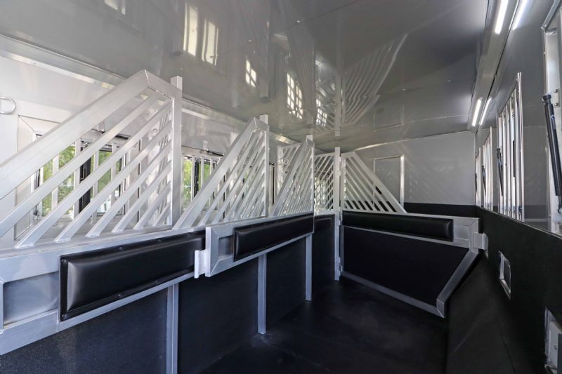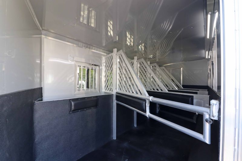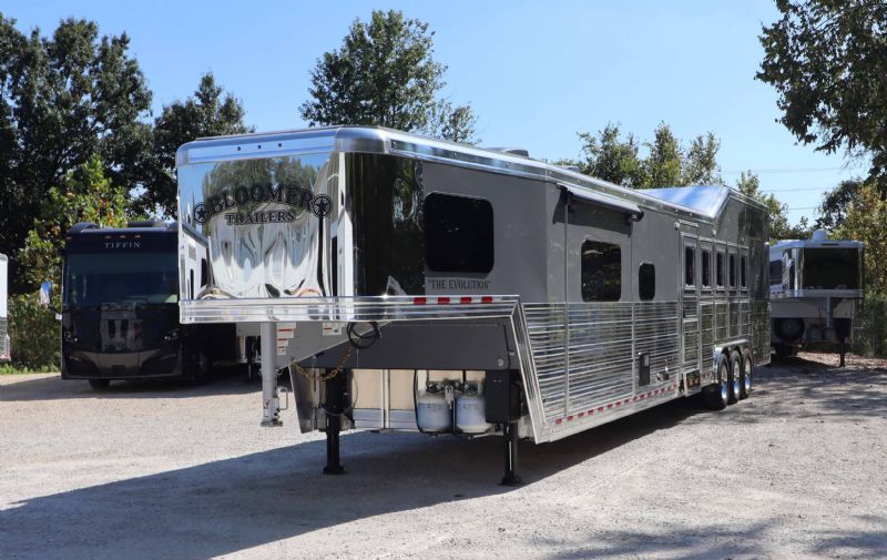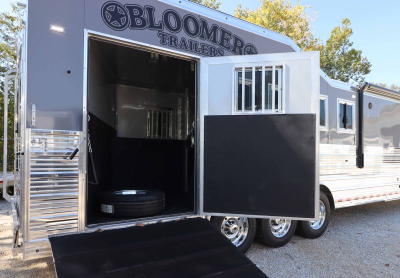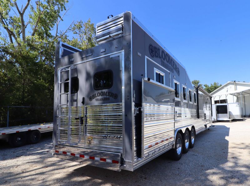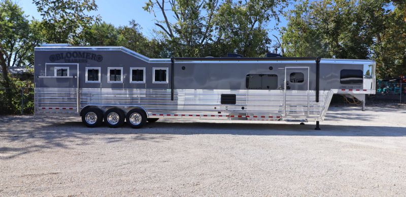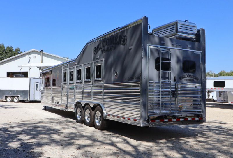 Model: 2026 Bloomer 5 Horse Overall Dimensions: 39'1'' L x 8' W x 7.5' H Configuration: 5+1 Horse Side Load FITS 6H Chassis: Triple HD 8k axles with hydraulic brakes for superior control and safety. Key Trailer Features: Wheels: 19.5'' Alcoa wheels paired with 18 Ply Continental tires for durability and smooth towing. Living Quarters: 15'9'' Trail Boss Conversion that comfortably sleeps 6, featuring a 78'' hydraulic slide-out Exterior: Charcoal skin, fully polished extruded sides, and a stainless steel front that offer both aesthetics and protection. Interior: Full back tack with a medicine cabinet, extensive shelving, and an integrated hay pod for optimal storage solutions. Luxury Living Quarters: Sofa and dinette convert to sleepers, alongside a fold-down bunk and a queen-sized mattress. Amenities: Equipped with an 5.5k Onan generator, dual hydraulic jacks, and a 18' electric awning with a protective shield. Kitchen and Bath: Features porcelain sinks, a stone backsplash, and a spacious bathroom with a marbled radius shower stall. Additional Features: Insulation: Fully insulated to maintain a comfortable interior climate regardless of external weather conditions. Accessibility: Features such as mangers, feed doorss, escape doors, and a walk-thru door into the LQ. Technology: 32 flat-screen TV with DVD, inside/outside speakers, and upgraded 4.5 interior lights to enhance your living experience. Measurements & Capacities: Length: 39'1'' Width: 8' Height: 7'6'' |