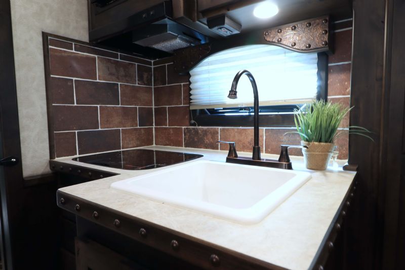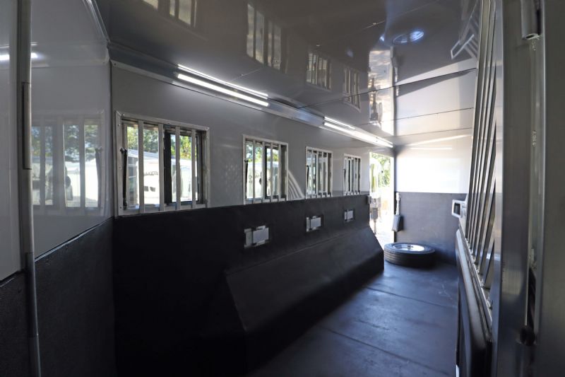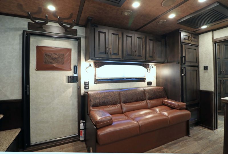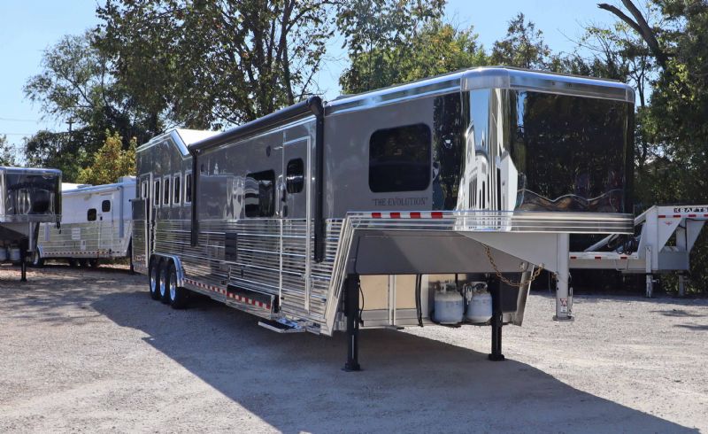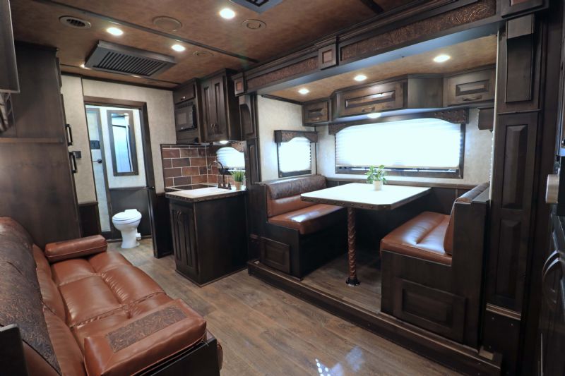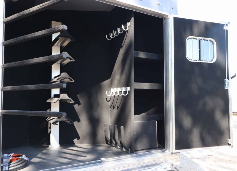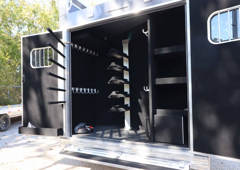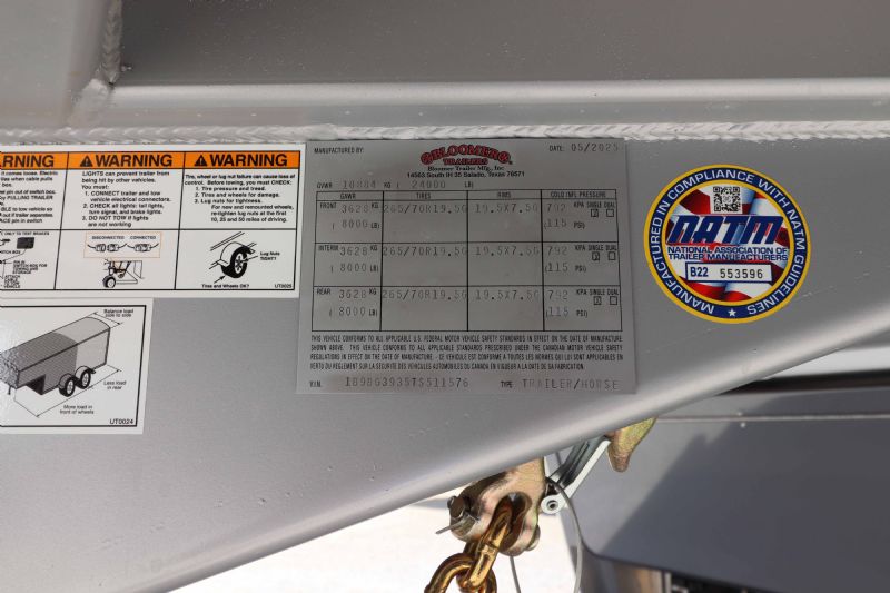 Model: 2026 Bloomer 5 Horse Overall Dimensions: 39'1'' L x 8' W x 7.5' H Configuration: 5+1 Horse Side Load FITS 6H Chassis: Triple HD 8k axles with hydraulic brakes for superior control and safety. Key Trailer Features: Wheels: 19.5'' Alcoa wheels paired with 18 Ply Continental tires for durability and smooth towing. Living Quarters: 15'9'' Trail Boss Conversion that comfortably sleeps 6, featuring a 78'' hydraulic slide-out Exterior: Charcoal skin, fully polished extruded sides, and a stainless steel front that offer both aesthetics and protection. Interior: Full back tack with a medicine cabinet, extensive shelving, and an integrated hay pod for optimal storage solutions. Luxury Living Quarters: Sofa and dinette convert to sleepers, alongside a fold-down bunk and a queen-sized mattress. Amenities: Equipped with an 5.5k Onan generator, dual hydraulic jacks, and a 18' electric awning with a protective shield. Kitchen and Bath: Features porcelain sinks, a stone backsplash, and a spacious bathroom with a marbled radius shower stall. Additional Features: Insulation: Fully insulated to maintain a comfortable interior climate regardless of external weather conditions. Accessibility: Features such as mangers, feed doorss, escape doors, and a walk-thru door into the LQ. Technology: 32 flat-screen TV with DVD, inside/outside speakers, and upgraded 4.5 interior lights to enhance your living experience. Measurements & Capacities: Length: 39'1'' Width: 8' Height: 7'6'' |