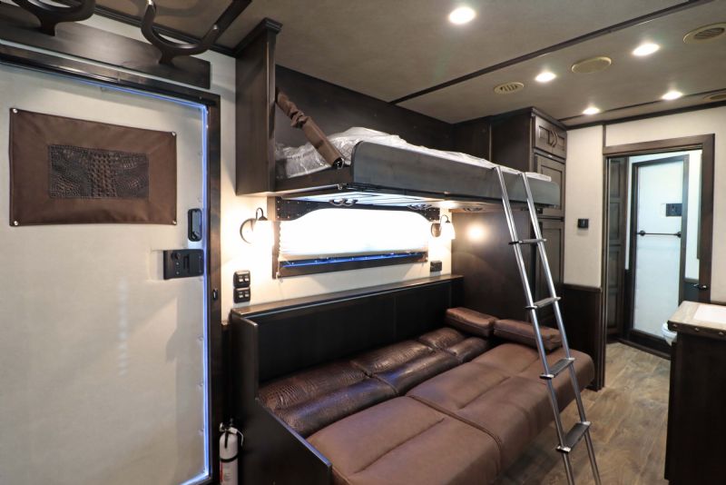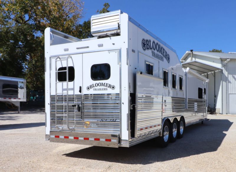 Call or Text Dave 314-498-9891 Email Dave@SOMTrailers.com Built to haul five horses in luxury and comfort. This New 2026 Bloomer 4+1 Horse Side Load Gooseneck Trailer features a premium 15'9'' Trail Boss Living Quarters, an XL rear stall for 5-horse capacity, and fully loaded upgrades throughout. Trailer Specifications Configuration: 4+1 Horse Side Load with XL Rear Stall Hauls 5 Dimensions: 35'8'' Floor Length 8 Wide 76 Tall Axles: Triple 8,000 lb HD Axles with Hydraulic Brakes Wheels/Tires: 17.5'' Alcoa Aluminum Wheels with 18-Ply Continental Tires Construction: All-Aluminum, Fully Insulated Exterior: White with Fully Polished Extruded Sides, Posts & Top Rail + Stainless Steel Nose Key Features: XL Rear Stall with 56'' Load Door 5-Horse Setup Integrated Hay Pod 78'' Hydraulic Slide-Out Dual Hydraulic Jacks Huge Rear Tack with Shelving, Medicine Cabinet & Combo Locks Drop-Down Head and Tail Windows Swing-Style Feed Doors Head Side European Frameless LQ Windows Mangers Under 4 Stalls Escape Door with Integrated Manger First Stall Stud Divider Keyless Entry on LQ and Tack Doors Walk-Through Door into Living Quarters Side Ramp Rear Mats Included Double Rear Doors Spare Tire Manufacturer Warranty Included 15'9'' Trail Boss Living Quarters Slide-Out: 78'' Hydraulic Slide Room Sleeping Capacity: Sleeps 6 Queen Mattress Sofa Sleeper Dinette Sleeper Fold-Down Bunk Interior Finishes: Hardwood Cabinets and Moldings Genuine Leather Sofa Yokes and Designer Valances Designer Tacks and Knobs Custom Backsplash & Backlit Countertops Wooden Hat Racks Pocket Sliding Screen Door Pocket Door into Bathroom Two Floor-to-Ceiling Wardrobe Closets Kitchen & Appliances: 6.0 cu. ft. Refrigerator Microwave Recessed Cooktop Single Kitchen Sink Onan Generator Bathroom Amenities: 32 Radius Shower Stall Vanity with Porcelain Sink Linen Closet Toilet Full Walk-Through Access Climate & Entertainment: Ducted 15K BTU A/C Unit Heat System AM/FM/CD/TV Antenna/DVD Flat-Screen TV with DVD Player Inside and Outside Speakers 18' Electric Awning with Protective Shield Dimensions Recap Floor Length: 35'8'' Width: 8' Height: 7'6'' |