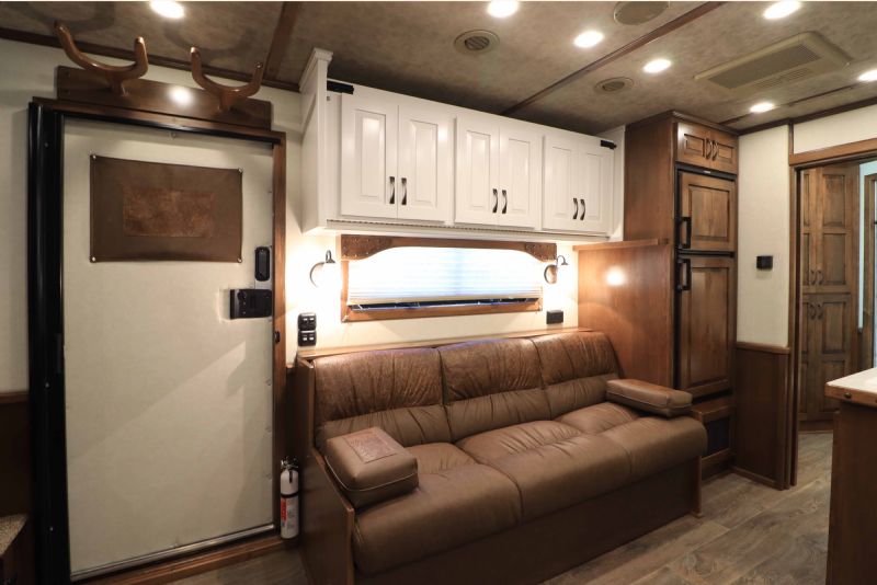 Trailer Specifications Configuration: 5+1 Horse Side Load with XL Rear Stall PC Load Fits 6 Horses Dimensions: 39'1 Floor Length 8' Wide 7'6'' Tall Axles: Triple 8,000 lb Heavy-Duty Axles with Hydraulic Disc Brakes Wheels/Tires: 19.5 Alcoa Wheels with Continental Tires Construction: All-Aluminum, Fully Insulated, Polished & Extruded with Stainless Steel Front Color: White Skin Key Exterior Features: Integrated Hay Pod Full Back Tack with Shelving & Medicine Cabinet European Frameless Windows in LQ Swing-Style Feed Doors Headside Mangers with Escape Door in First Stall Drop-Down Head & Tail Windows Stud Divider Keyless Entry on LQ & Tack Doors Walk-Through Door to LQ Dual Hydraulic Jacks Spare Tire & Double Rear Doors 15'9 Trail Boss Living Quarters with 78 Hydraulic Slide-Out Designed for comfort and functionality, this LQ sleeps up to 6 suiting larger families. Sleeping & Seating: Queen Mattress in Gooseneck Sofa Sleeper & Dinette Sleeper Fold-Down Bunk Bed Kitchen & Appliances: 6.0 cu.ft. Refrigerator Recessed Cooktop & Microwave Single Kitchen Sink Porcelain Sinks & Stone Backsplash Backlit Countertops with Designer Cabinetry Bathroom Amenities: Marbled 32 Radius Shower Stall Porcelain Toilet Vanity with Sink & Linen Storage Pocket Door into Bath & Sliding Pocket Screen Entry Comfort & Technology: 5.5k Onan Generator 15K BTU Ducted A/C 20K BTU Furnace 32 Flat Screen TV with DVD Player Inside/Outside Speaker System AM/FM/CD Stereo Entertainment Hub 18 Electric Awning with Weather Shield Interior Finish Highlights: Upgraded 4.5 LED Interior Lights Genuine Leather Accents Hardwood Cabinets, Moldings & Hat Racks Designer Knobs, Lighting, and Sconces Dual Floor-to-Ceiling Wardrobe Closets Dimensions Recap Floor Length: 39'1'' Width: 8' Height: 7'6'' |
