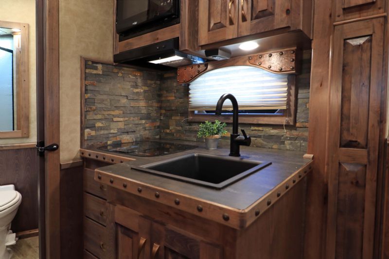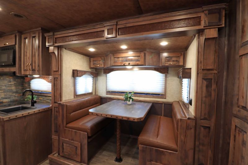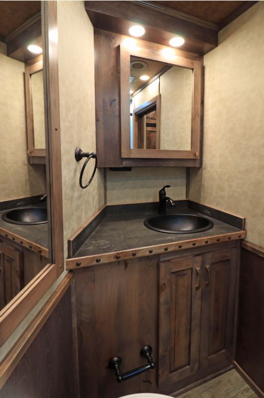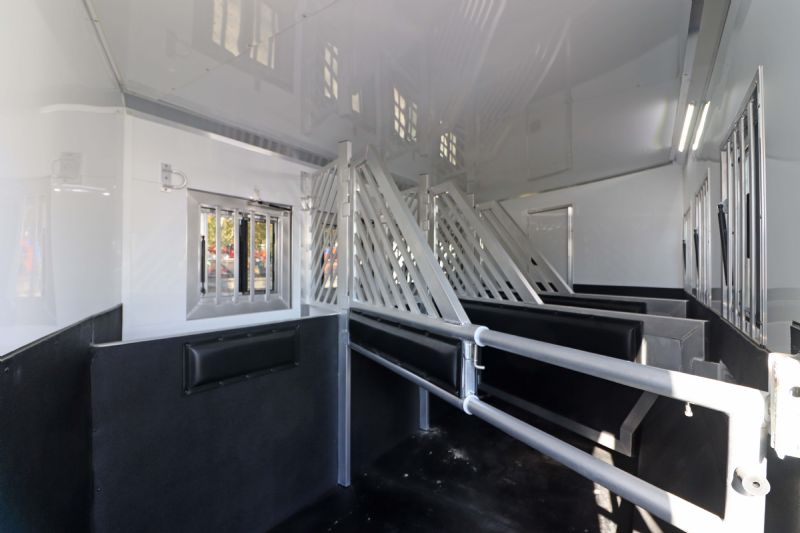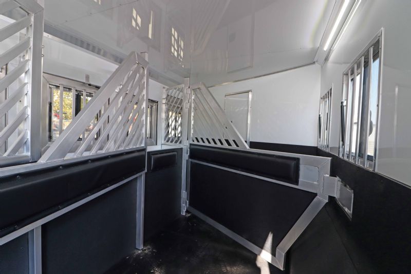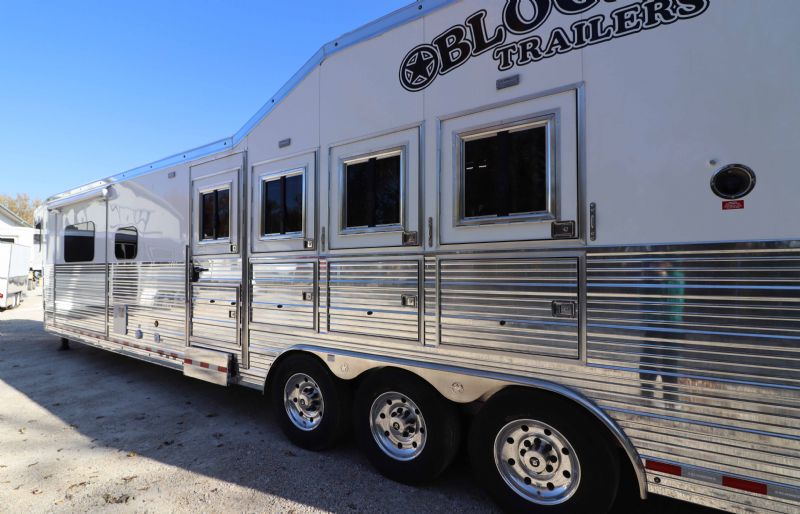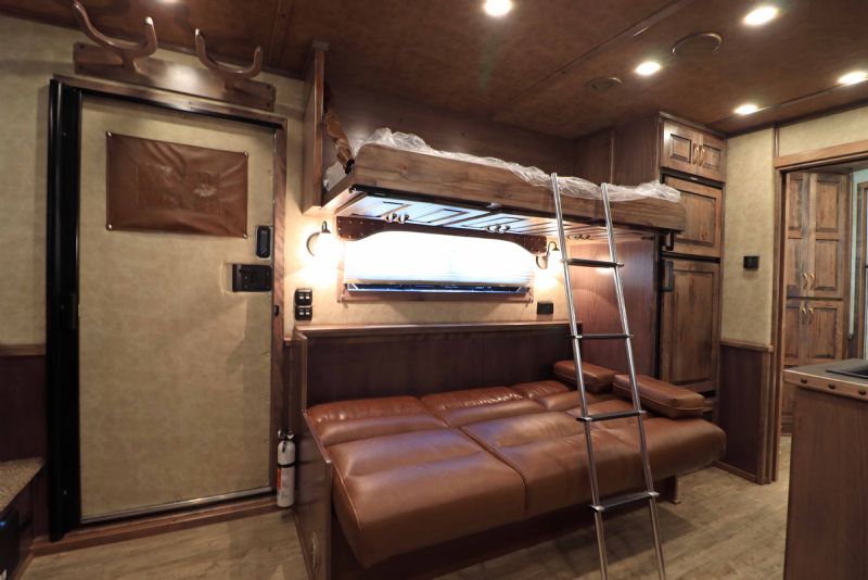 Overall Dimensions: 34'11'' L x 8' W x 7.5' H Configuration: 4 Horse Side Load with a Gooseneck Hitch Chassis: Triple HD 8k axles with hydraulic brakes for superior control and safety. Key Trailer Features: Wheels: 17.5 Alcoa wheels paired with 18 Ply Continental tires for durability and smooth towing. Living Quarters: 15' 9'' Trail Boss Conversion that comfortably sleeps 6, featuring a 77 hydraulic slide-out Exterior: White skin, fully polished extruded sides, and a stainless steel front that offer both aesthetics and protection. Interior: Full back tack with a medicine cabinet, extensive shelving, and an integrated hay pod for optimal storage solutions. Luxury Living Quarters: Comfort: Sofa and dinette convert to sleepers, alongside a fold-down bunk and a queen-sized mattress. Amenities: Equipped with 4k Onan generator, dual hydraulic jacks, and a 19' electric awning with a protective shield. Kitchen and Bath: Features porcelain sinks, a stone backsplash, upgraded German Beech cabinets, and a spacious bathroom with a marbled radius shower stall. Additional Features: Insulation: Fully insulated to maintain a comfortable interior climate regardless of external weather conditions. Accessibility: Features such as mangers with integrated feed doors, escape doors, and a walk-thru door into the LQ for easy movement throughout the trailer. Technology: 32 flat-screen TV with DVD, inside/outside speakers, and upgraded 4.5 interior lights to enhance your living experience. Measurements & Capacities: Length: 34'11'' Width: 8' Height: 7' 6'' |