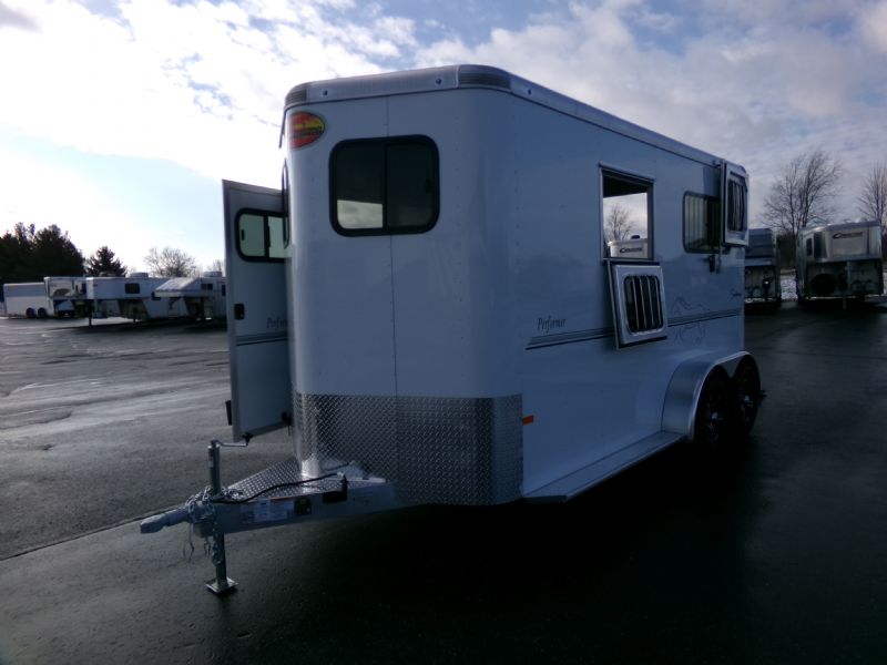 | 2026 Sundowner Performer 2 Horse Straight load with walk thru between mangers, 7' 6" Tall, 6' 9" wide, Rear ramp as rear door with wrap around tail curtains, Upgrade to Weld on hinges, Gravel guard on nose, Load lights, Large dressing room with pull out saddle racks, bridle hooks, spare tire and more. Contact Jim Kelly for more info 616-887-3456 or 616-437-2080.