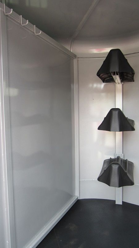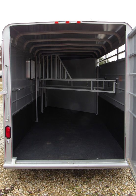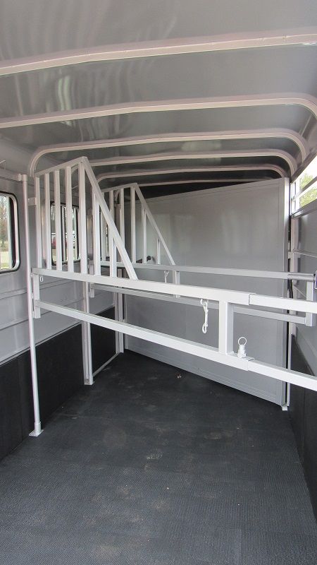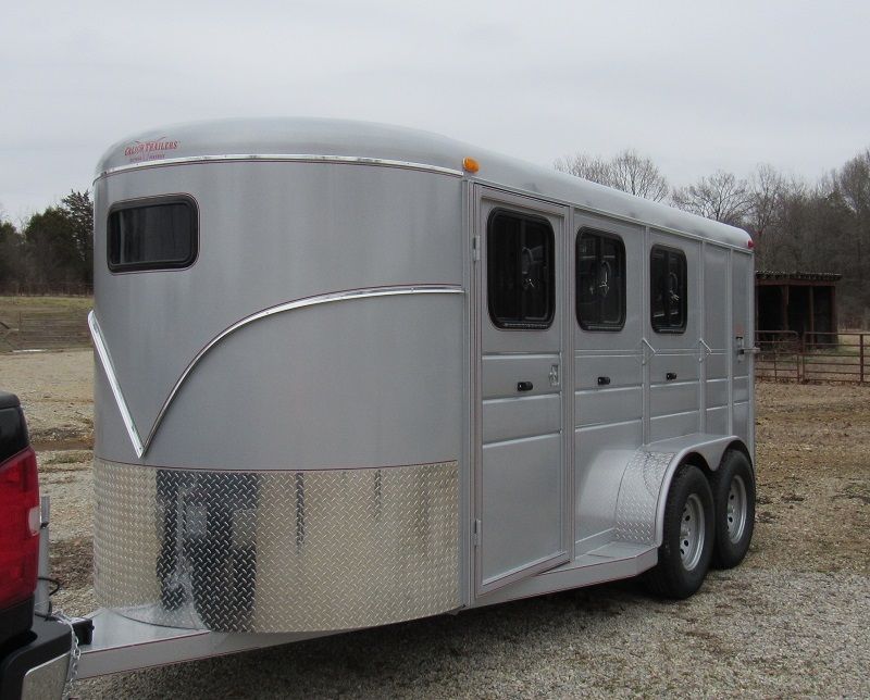 | New Calico 3 horse, 17' long x 6' wide x 6'6" tall, 2880 lbs, fixed wall dressing room, dome lights, drop-down windows head side, 3 saddle racks, 16-inch 10-ply radial tires, torflex axles, window in dressing room door, V-chrome on front, 24" gravel guard, brakes on both axles. Includes rubber package -- mats on floor, rubber on walls, and spare tire.
