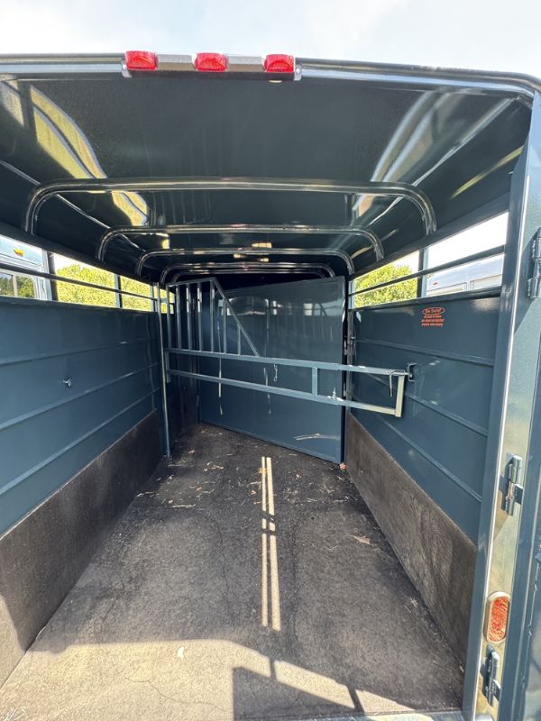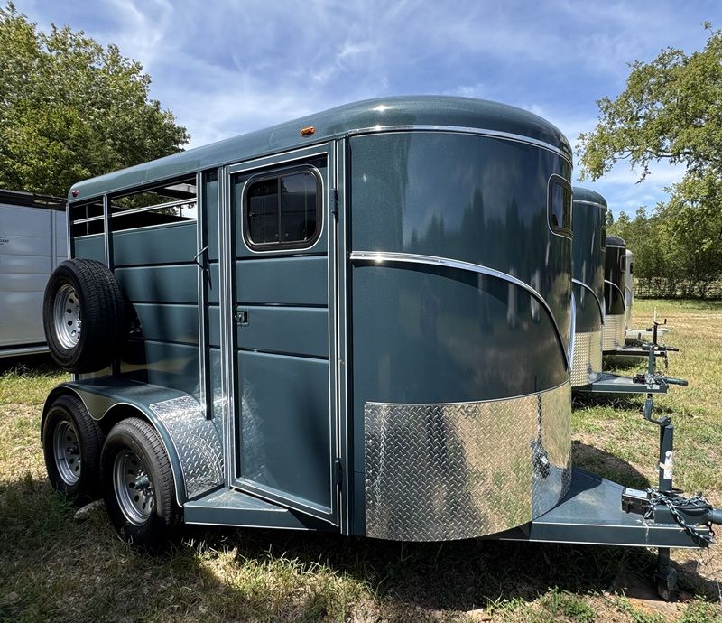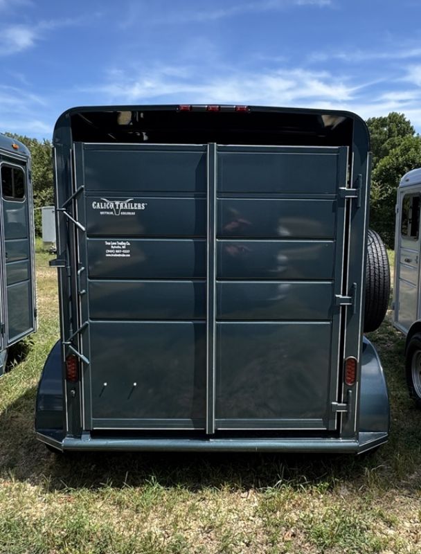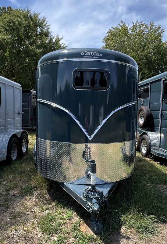 | New Calico 2 horse slant load, 12 x 6 x 6'6", 2740 lbs, swing wall dressing room, window in dressing room door, dome lights in dressing room and horse area, V-chrome on the front, 2 saddle racks, torflex axles, rubber on both walls, floor mats, including dressing room, spare tire.