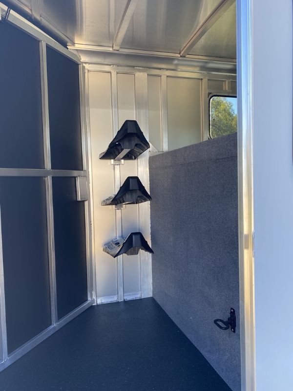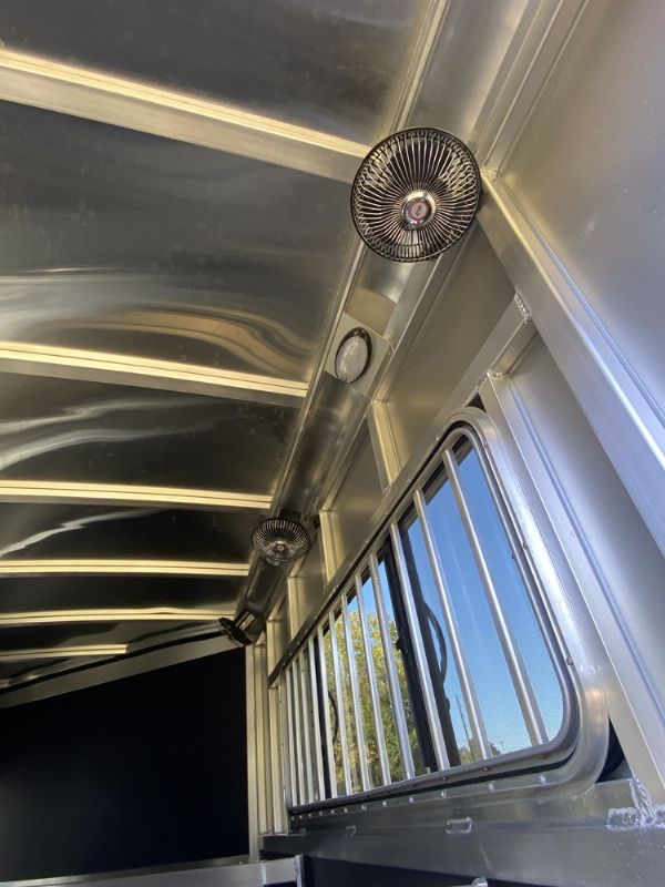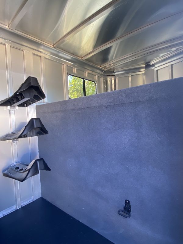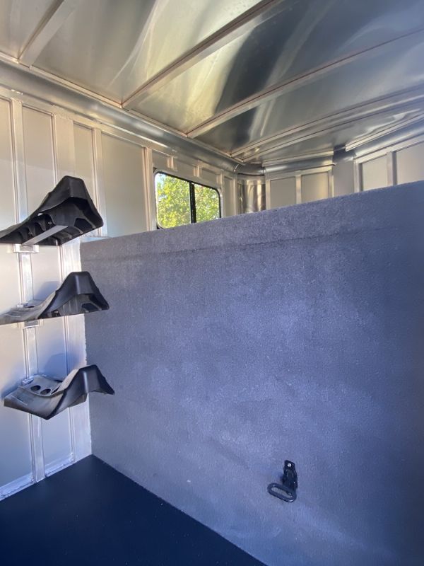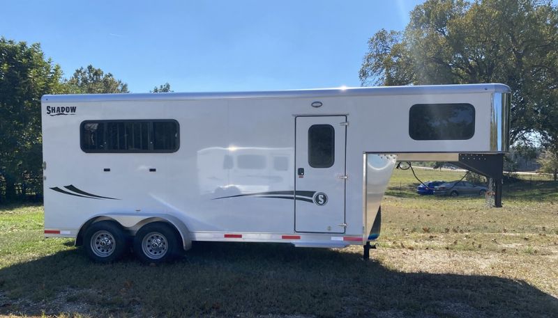 | New Shadow 3 horse slant load gooseneck. 17 on the floor, 76 x 246 overall length, 64 wide. Escape door, 5200# spring leaf axles, spare, dressing room with saddle racks, dome light, bridle hooks, slider windows in GN nose. 24 x 32 drop feed windows streetside, drop feed windows curbside and rear door. Horse area lights, rumber lined lower walls.
