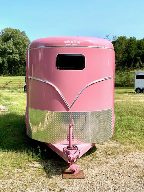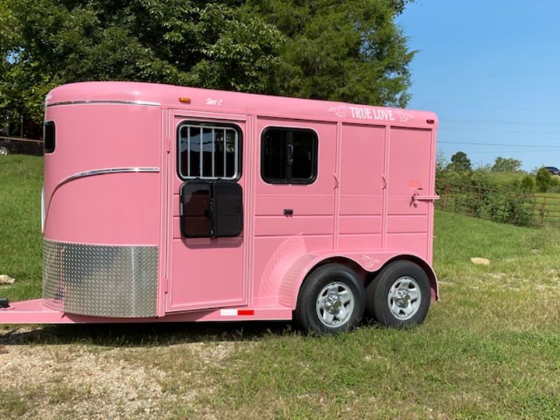 | True Love Pink! 2 horse slant load bumper pull, 6' wide x 6.6' tall x 13' long, 2680 lbs, 3500# axles, solid wall dressing room with window in dressing room door, dome lights, V-chrome on front, 24" gravel guard, 16-inch 10-ply radial tires, drop-down windows head side, 2 saddle racks, torflex axles, mats, including dressing room, rubber on both walls, spare tire. Pink package includes pony decals and hub covers.