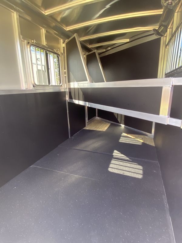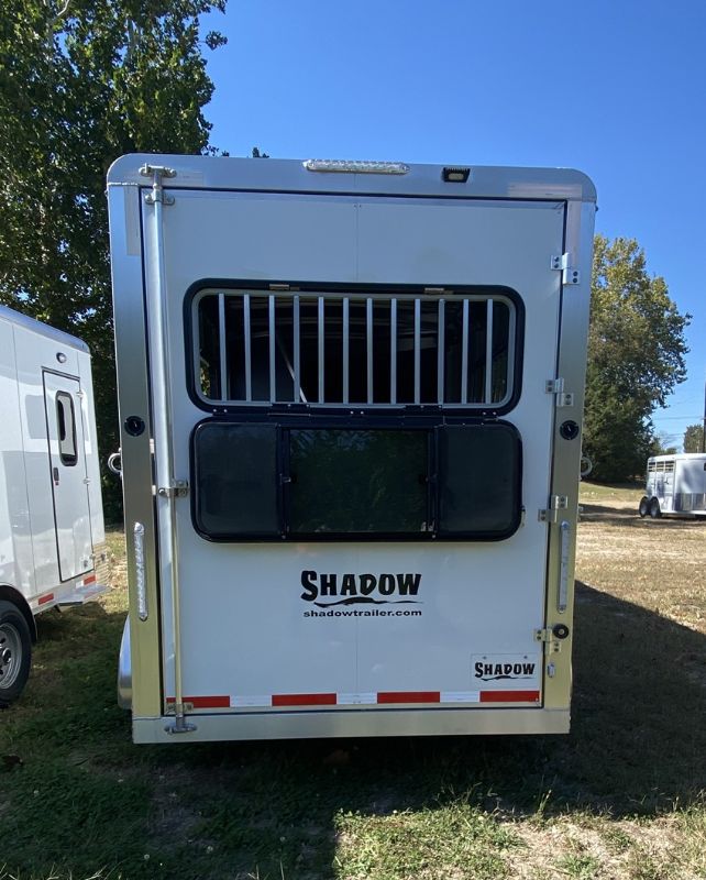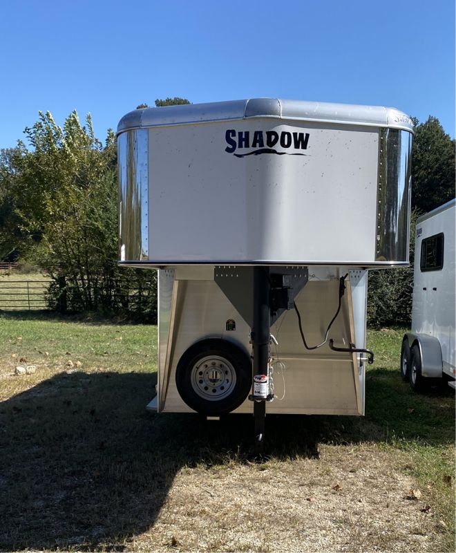 | New Shadow 3 horse slant load gooseneck. 17 on the floor, 76 x 246 overall length, 64 wide. Escape door, 5200# spring leaf axles, spare, dressing room with saddle racks, dome light, bridle hooks, slider windows in GN nose. 24 x 32 drop feed windows streetside, drop feed windows curbside and rear door. Horse area lights, rumber lined lower walls.