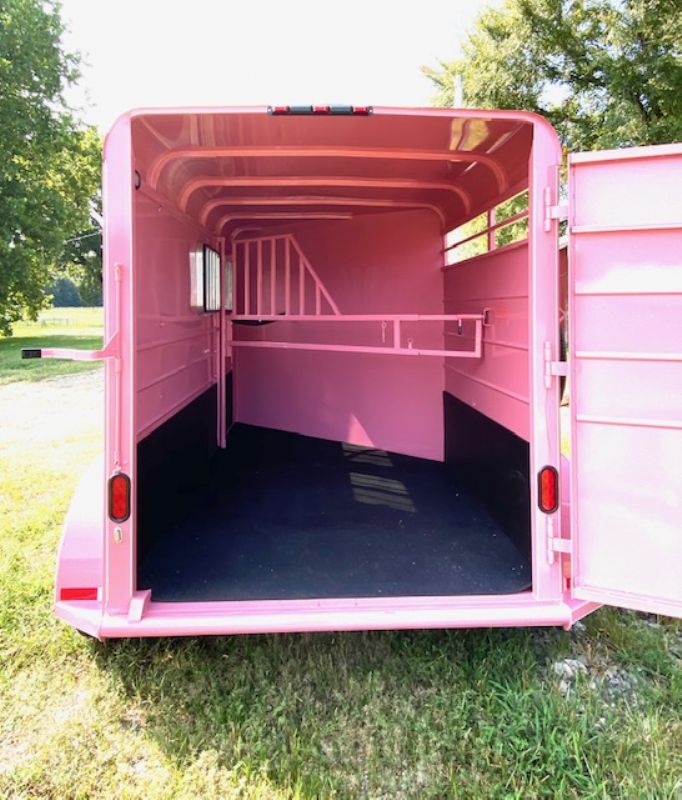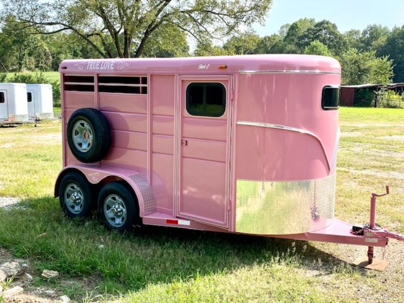 | True Love Pink! 2 horse slant load bumper pull, 6' wide x 6.6' tall x 13' long, 2680 lbs, 3500# axles, solid wall dressing room with window in dressing room door, dome lights, V-chrome on front, 24" gravel guard, 16-inch 10-ply radial tires, drop-down windows head side, 2 saddle racks, torflex axles, mats, including dressing room, rubber on both walls, spare tire. Pink package includes pony decals and hub covers.