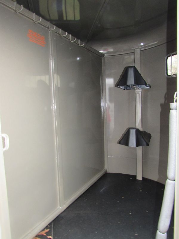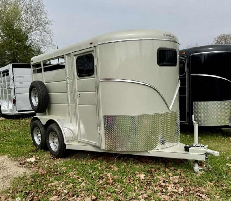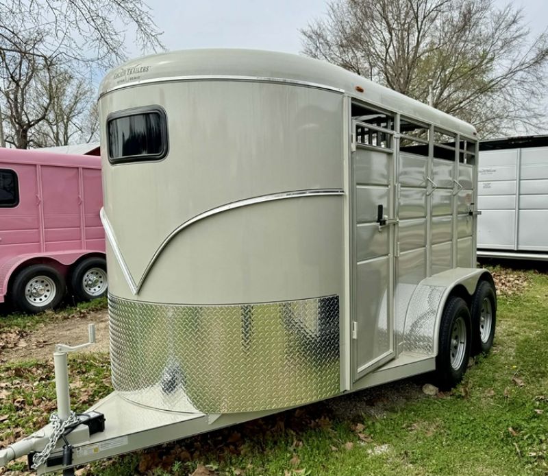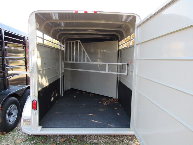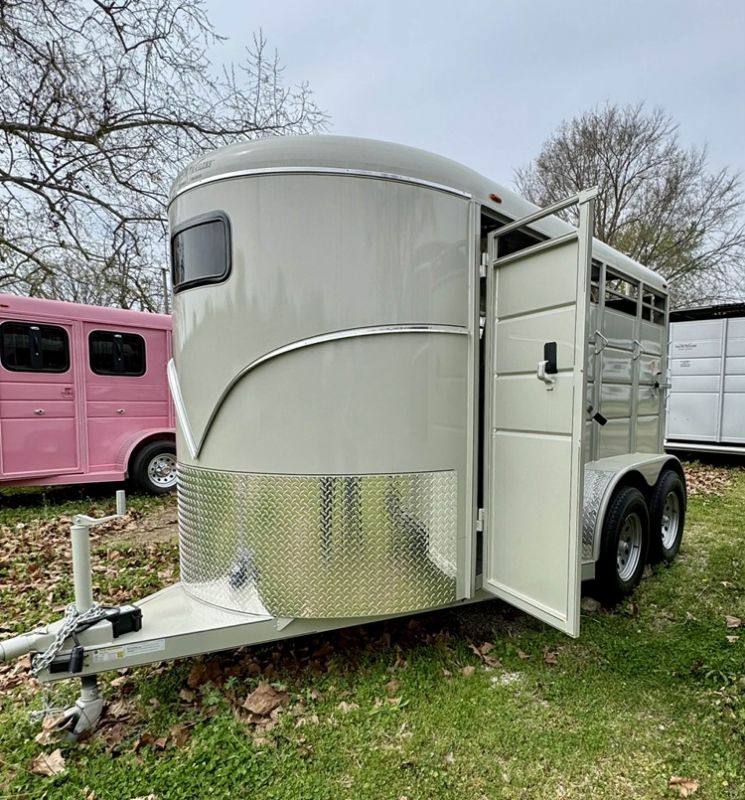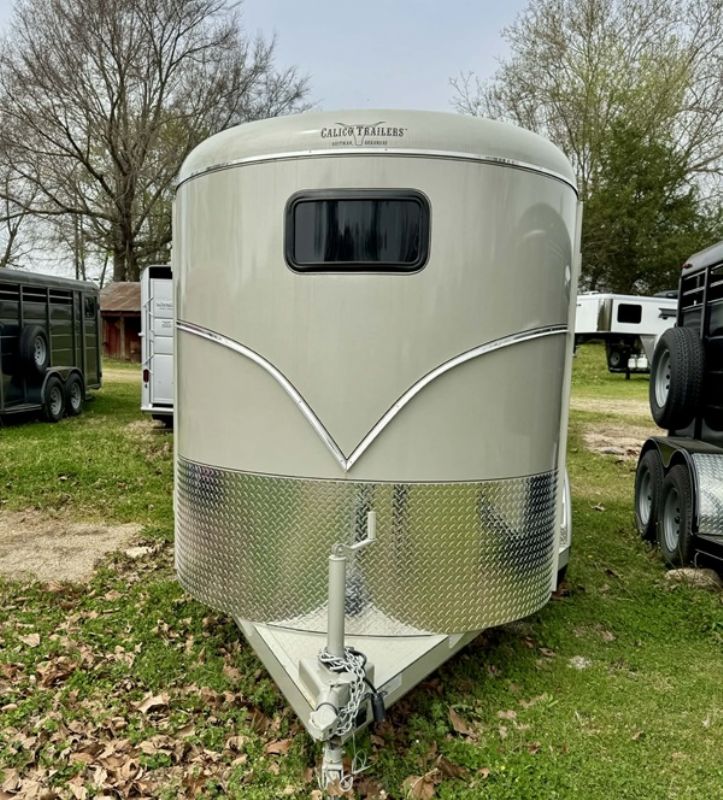 | New Calico 2 horse slant load, 12 x 6 x 6'6", 2740 lbs, swing wall dressing room, window in dressing room door, dome lights in dressing room and horse area, V-chrome on the front, 2 saddle racks, torflex axles, rubber on both walls, floor mats, including dressing room, spare tire.