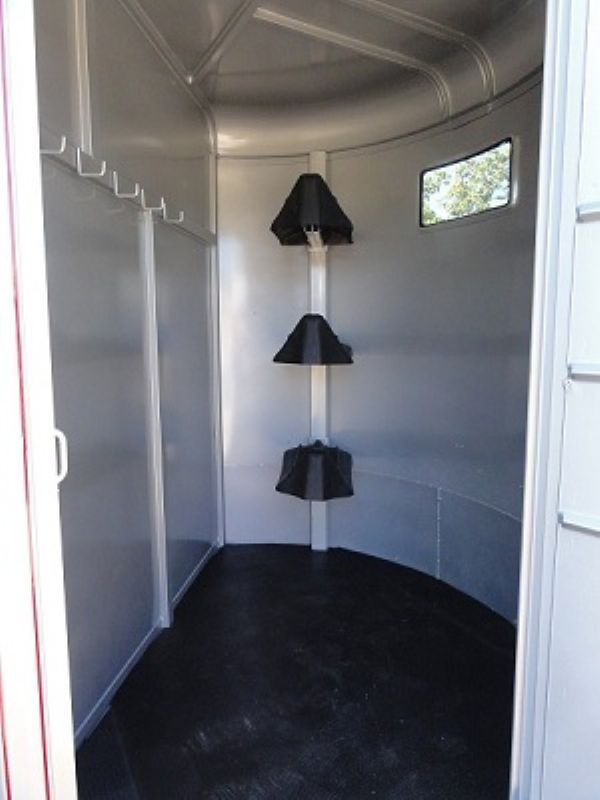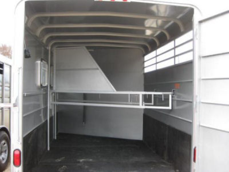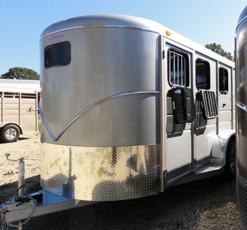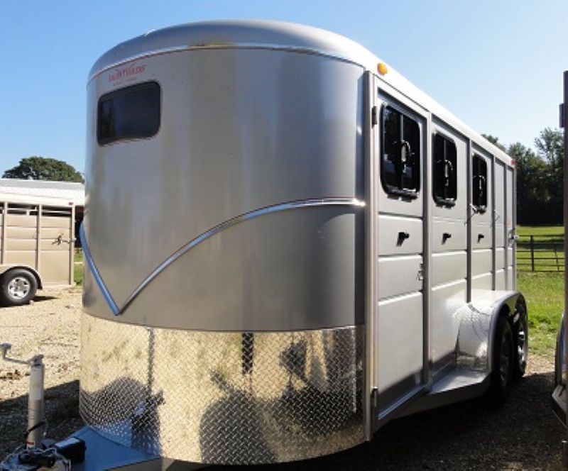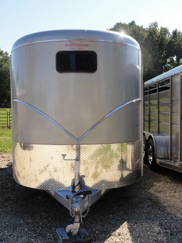 | New Calico 3 horse slant load trailer, extra tall and extra wide, 6'8" x 7' x 17', 3380 lbs. Solid wall dressing room, window in drs room door, 3 saddle racks, 16-in 10-ply tires, V-chrome, 2 dome lights, low profile roof, 3 drop-down windows, slam latch on dividers, rubber on both walls, floor mats, including dressing room, spare tire, torflex axles, brakes on both axles, 123" Stalls! Other colors available.