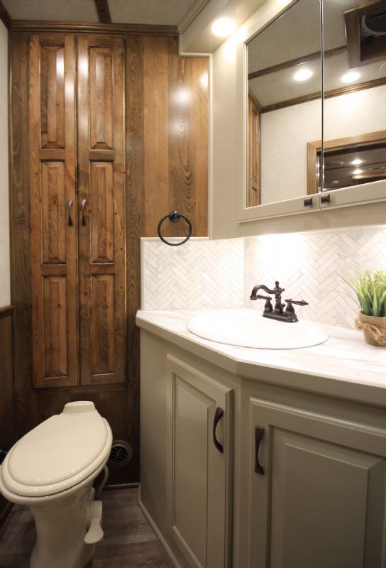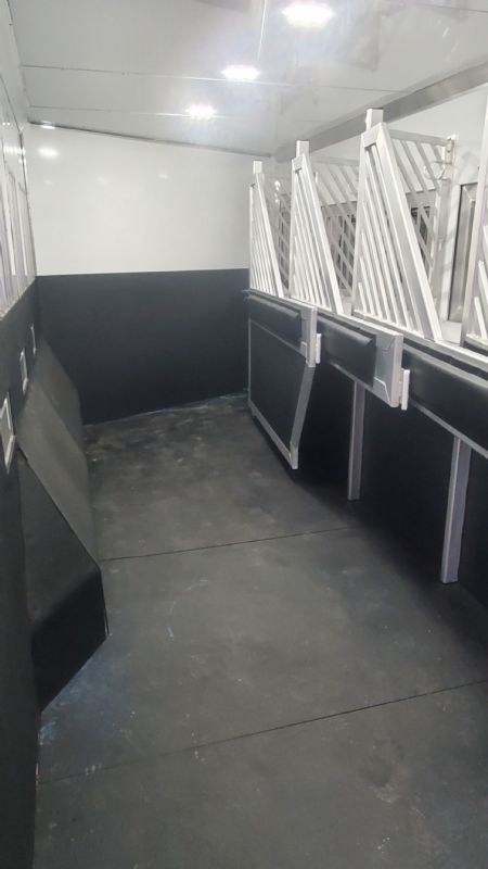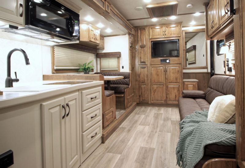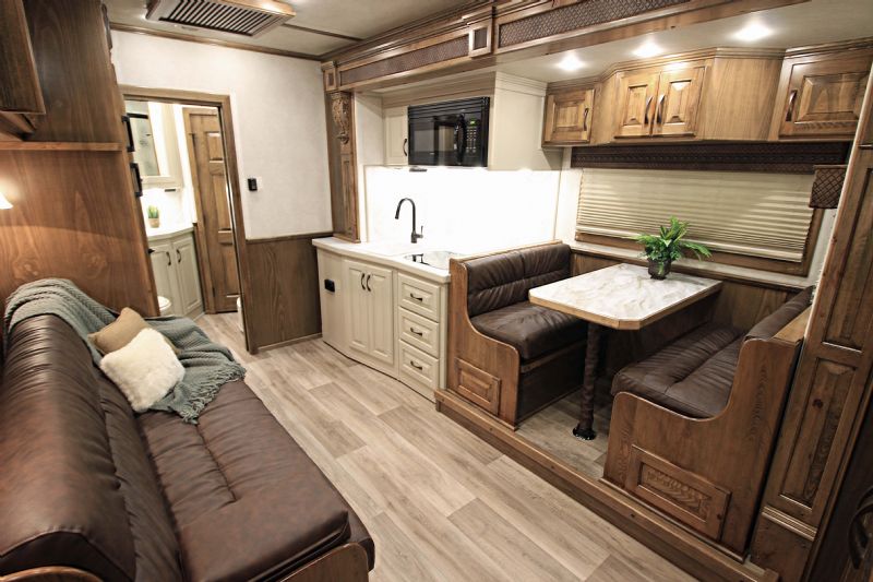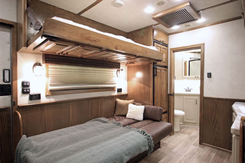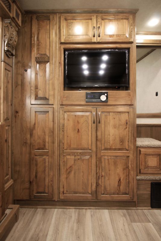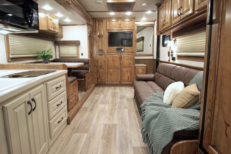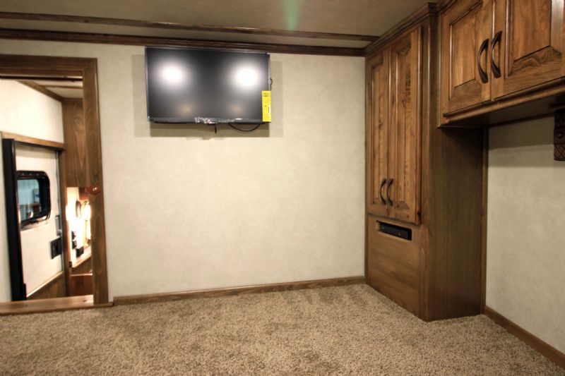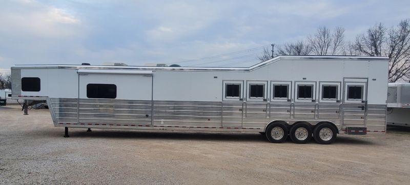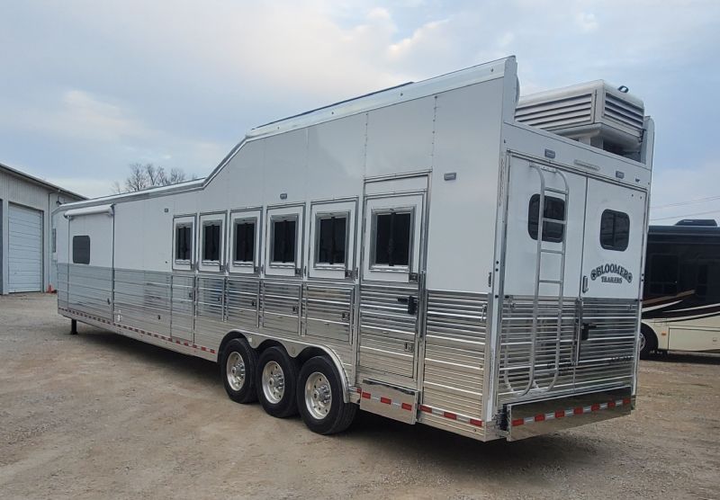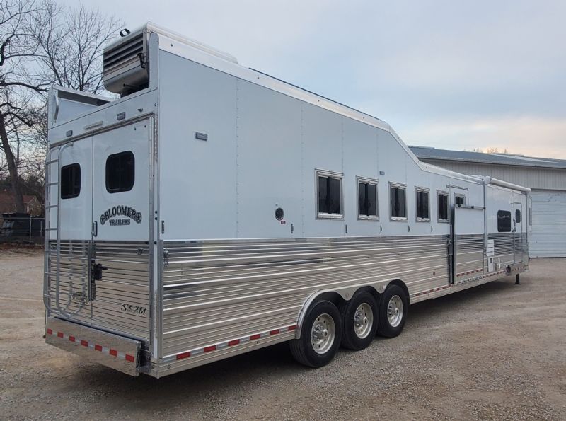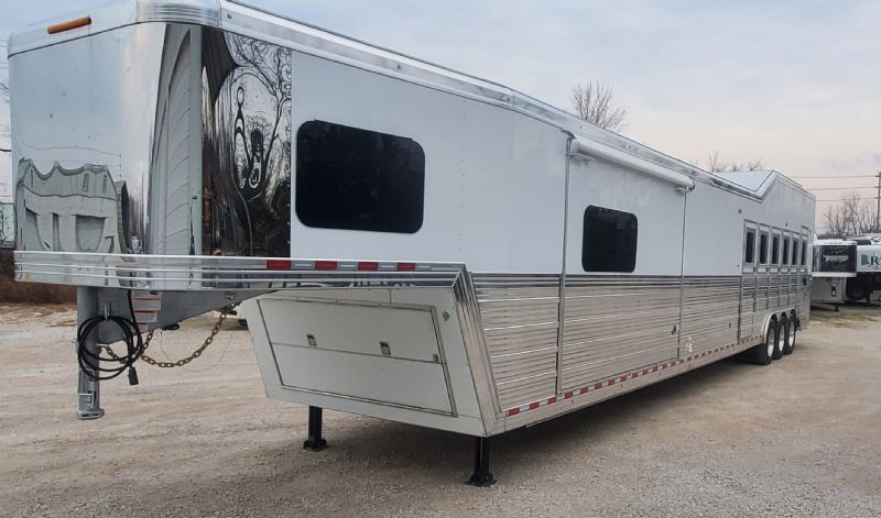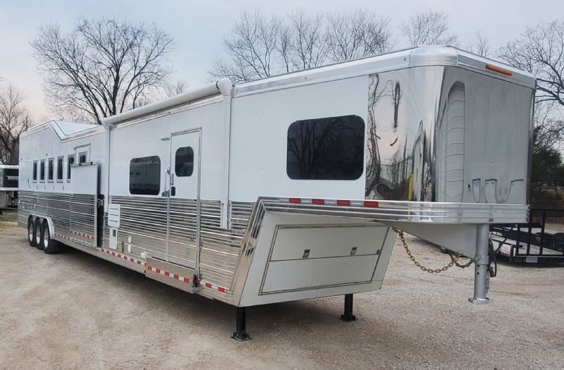 | Custom 6 Horse Bloomer with 17' sw by Trail Boss Conversion on order. Discounts will be offered for a pre sale and buyer would be able to select do all of the interior design and colors. Trailer Features: 43'11" floor, 8' tall, 8' wide, trip 10k Air Ride axles, Markers top and bottom, Closed front over LP bottles, hydraulic slide, Mangers, Escape door, Stud divider, Stall camera, Integrated pod, 30" short wall on full rear tack. LQ Features: 17' Custom Trail Boss, 7K Onan Gen, 2 AC units, 8.0 fridge, Flush mount cooktop, , Convection oven micro, 20' awning, Sofa and dinette, Fold down bunk, Solid surface backsplash, 2 Tone painted cabinets, Wifi antenna, Central vac, 36" shower and walk in closet. Trades, Financing and Free Limited delivery available. |