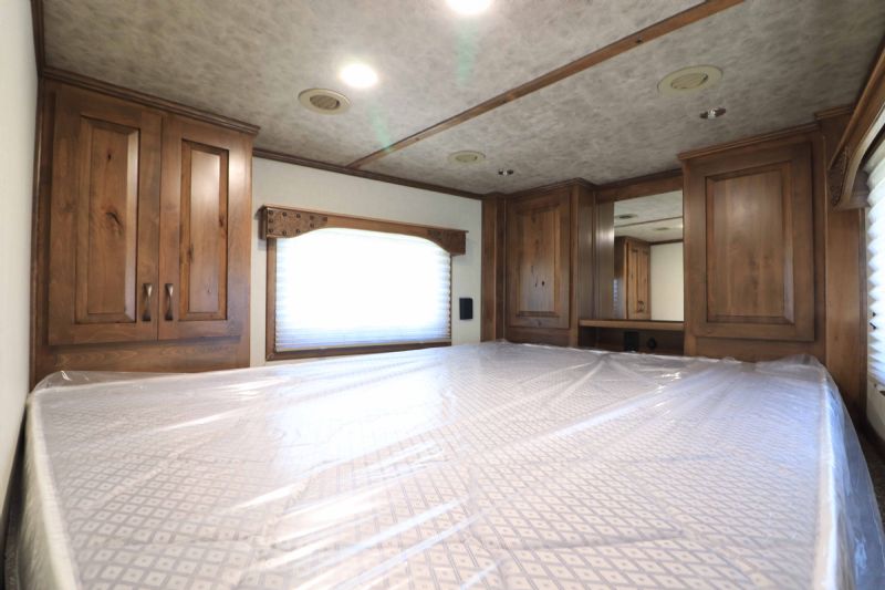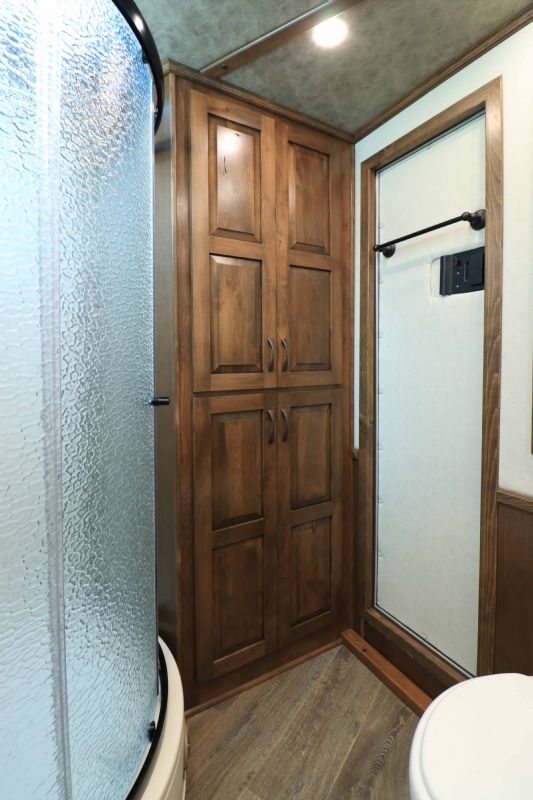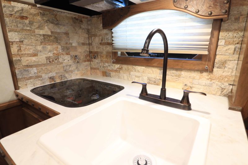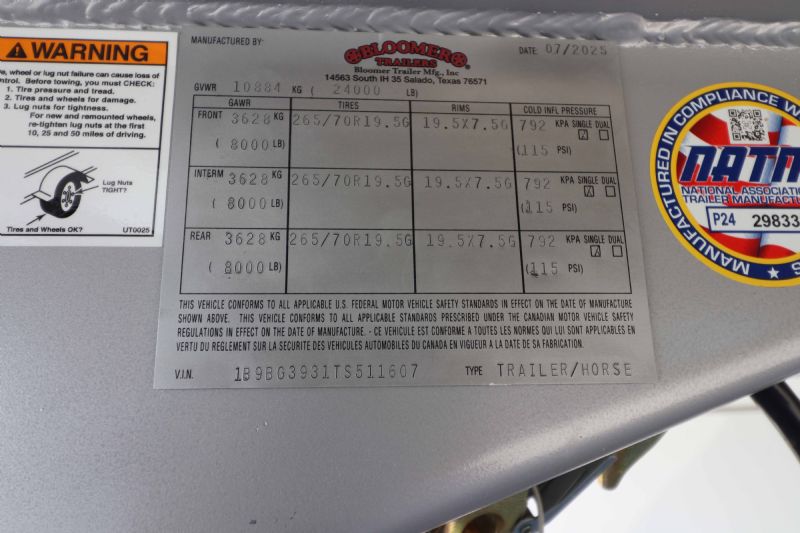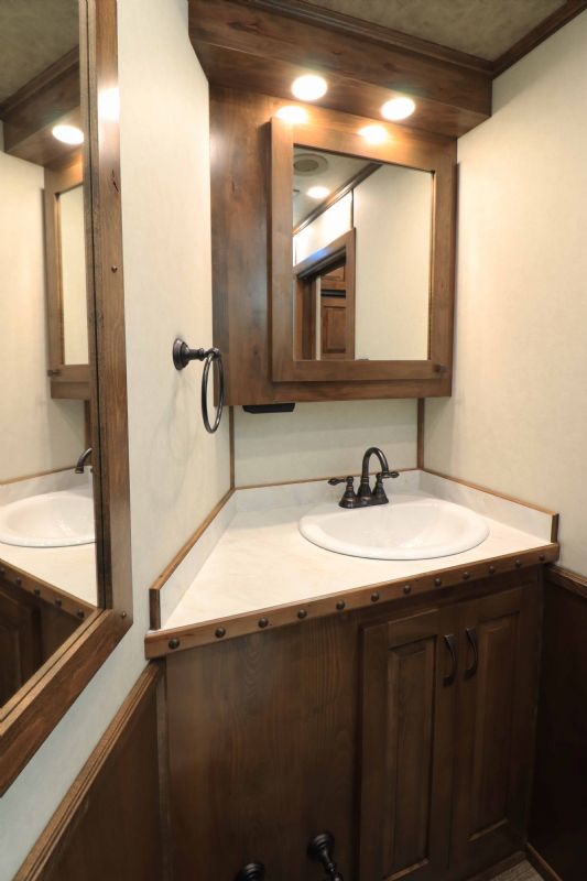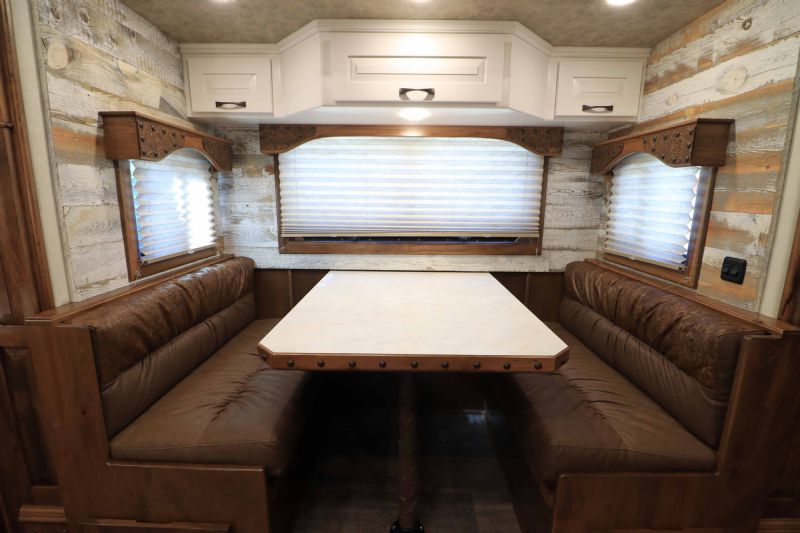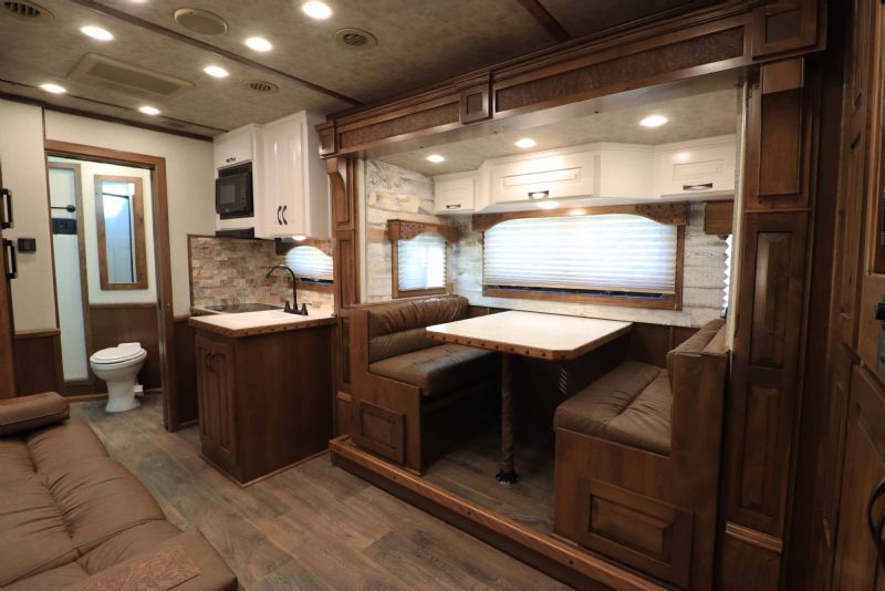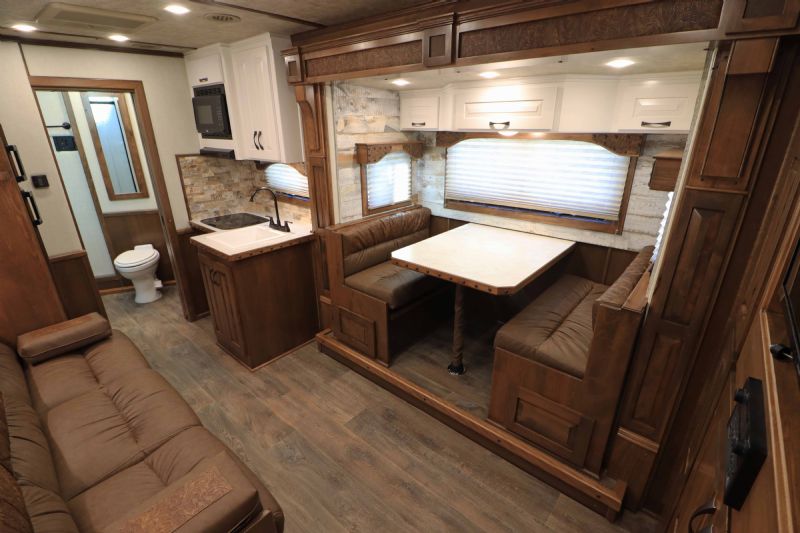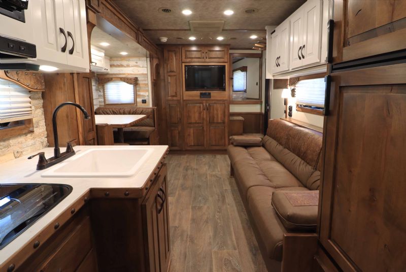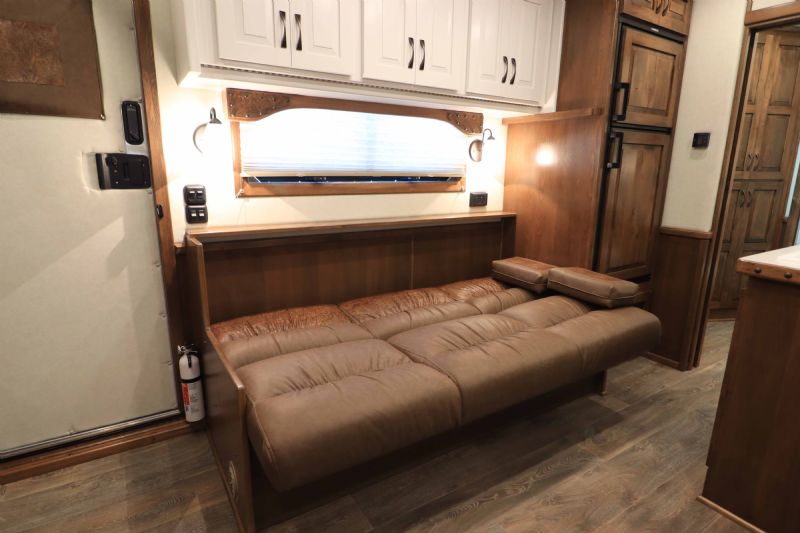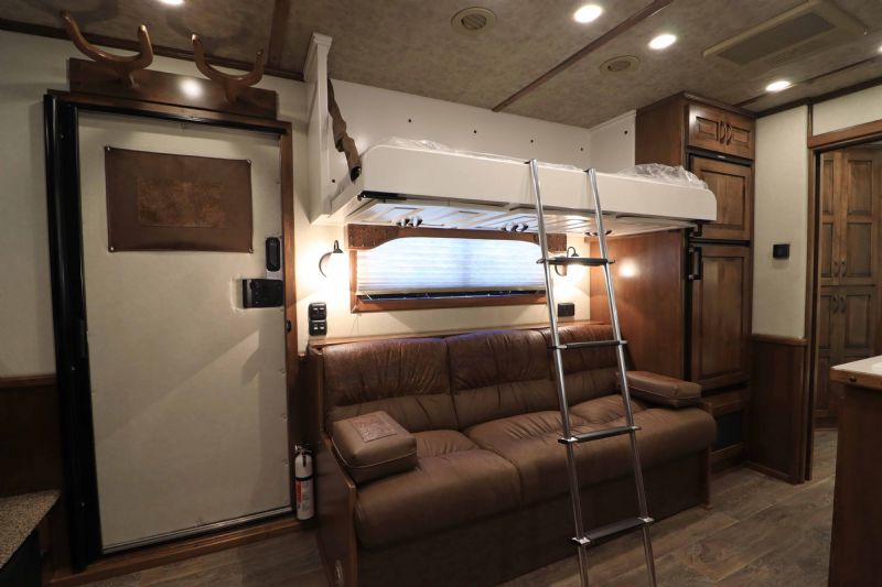 Trailer Specifications Configuration: 5+1 Horse Side Load with XL Rear Stall PC Load Fits 6 Horses Dimensions: 39'1 Floor Length 8' Wide 7'6'' Tall Axles: Triple 8,000 lb Heavy-Duty Axles with Hydraulic Disc Brakes Wheels/Tires: 19.5 Alcoa Wheels with Continental Tires Construction: All-Aluminum, Fully Insulated, Polished & Extruded with Stainless Steel Front Color: White Skin Key Exterior Features: Integrated Hay Pod Full Back Tack with Shelving & Medicine Cabinet European Frameless Windows in LQ Swing-Style Feed Doors Headside Mangers with Escape Door in First Stall Drop-Down Head & Tail Windows Stud Divider Keyless Entry on LQ & Tack Doors Walk-Through Door to LQ Dual Hydraulic Jacks Spare Tire & Double Rear Doors 15'9 Trail Boss Living Quarters with 78 Hydraulic Slide-Out Designed for comfort and functionality, this LQ sleeps up to 6 suiting larger families. Sleeping & Seating: Queen Mattress in Gooseneck Sofa Sleeper & Dinette Sleeper Fold-Down Bunk Bed Kitchen & Appliances: 6.0 cu.ft. Refrigerator Recessed Cooktop & Microwave Single Kitchen Sink Porcelain Sinks & Stone Backsplash Backlit Countertops with Designer Cabinetry Bathroom Amenities: Marbled 32 Radius Shower Stall Porcelain Toilet Vanity with Sink & Linen Storage Pocket Door into Bath & Sliding Pocket Screen Entry Comfort & Technology: 5.5k Onan Generator 15K BTU Ducted A/C 20K BTU Furnace 32 Flat Screen TV with DVD Player Inside/Outside Speaker System AM/FM/CD Stereo Entertainment Hub 18 Electric Awning with Weather Shield Interior Finish Highlights: Upgraded 4.5 LED Interior Lights Genuine Leather Accents Hardwood Cabinets, Moldings & Hat Racks Designer Knobs, Lighting, and Sconces Dual Floor-to-Ceiling Wardrobe Closets Dimensions Recap Floor Length: 39'1'' Width: 8' Height: 7'6'' |