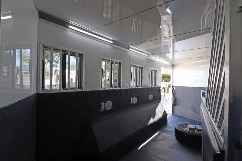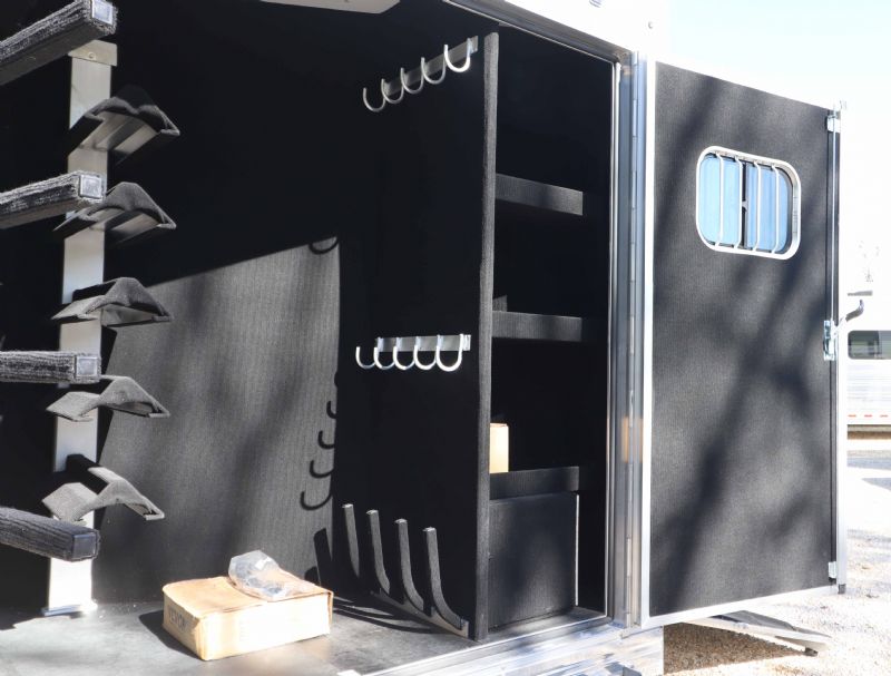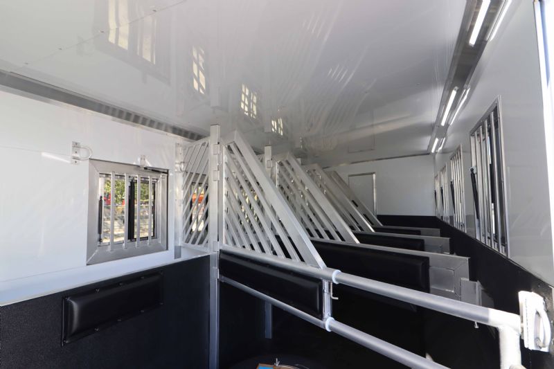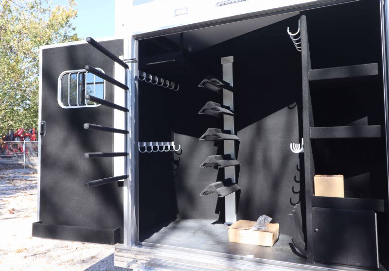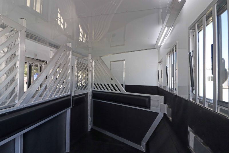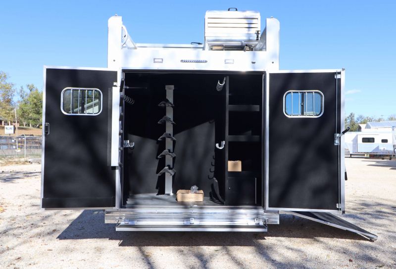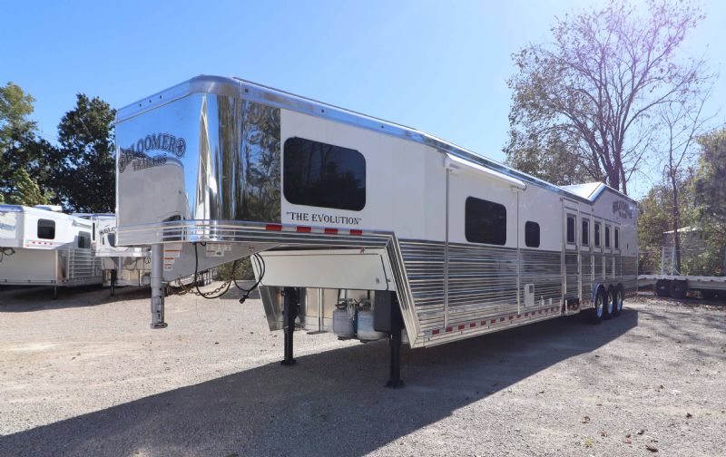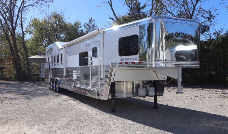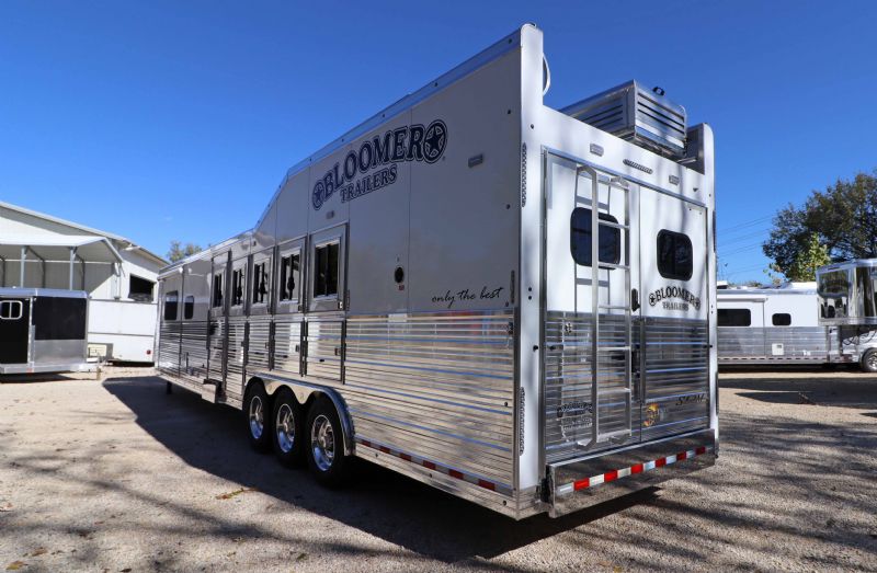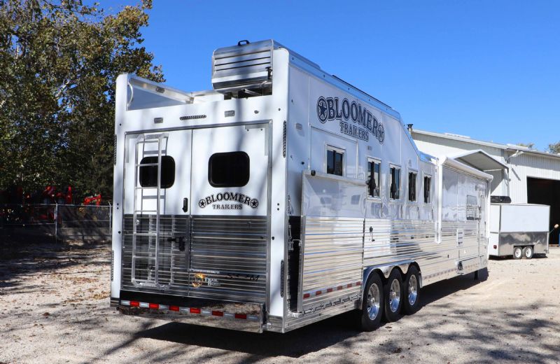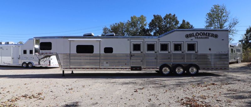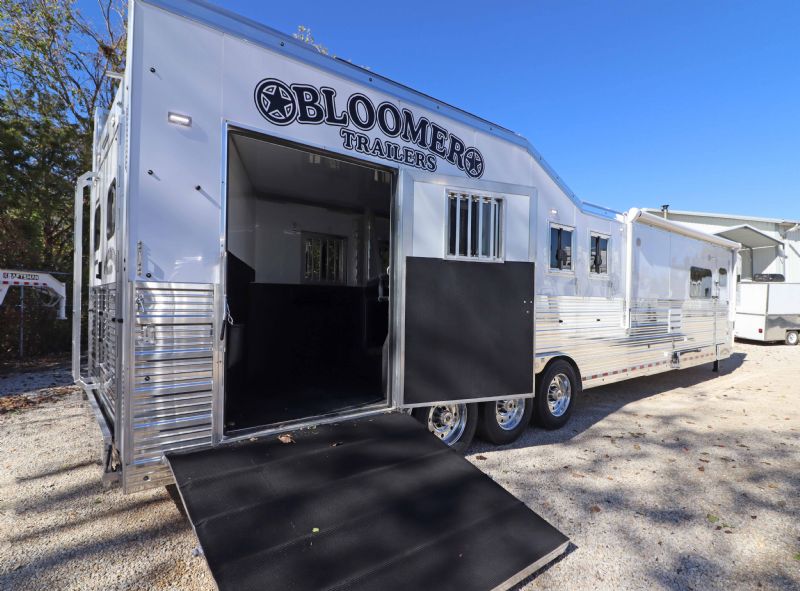 | New 2026 Bloomer 5.5 Horse with 15'9'' Trail Boss Living Quarters, Hydraulic Slide & Integrated Hay Pod. 2 AC's. Features a luxurious 15'9'' Trail Boss Conversion, 78'' hydraulic slide-out, and a versatile 5+1 slant load set up that hauls 6H. White exterior and fully polished aluminum frame to complete the upscale aesthetic.