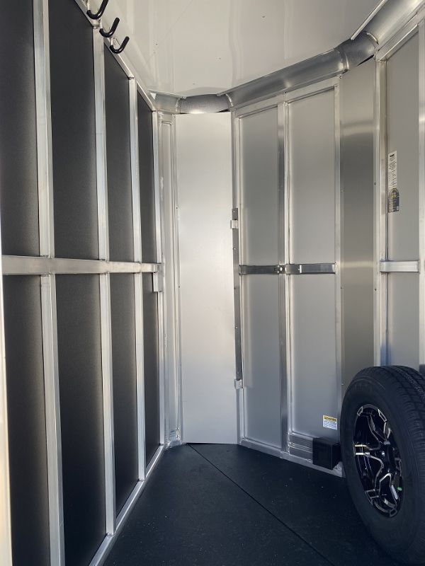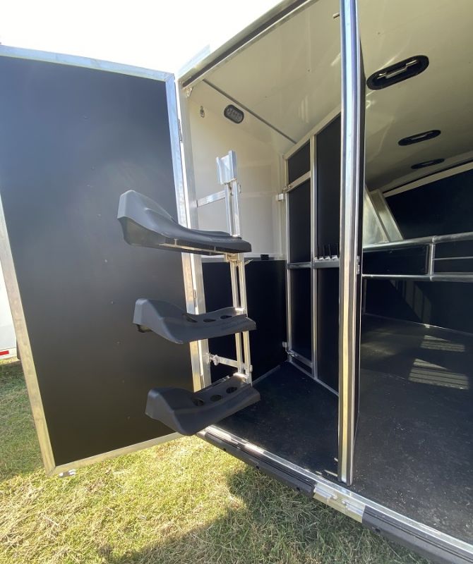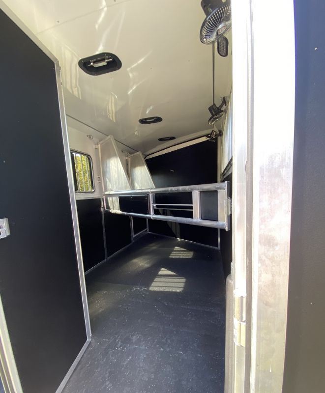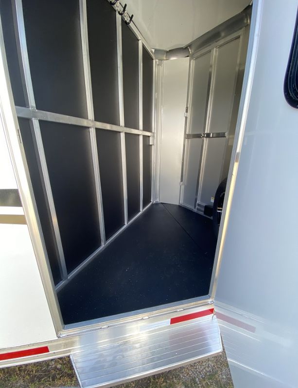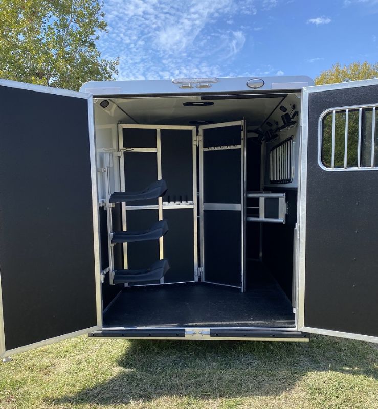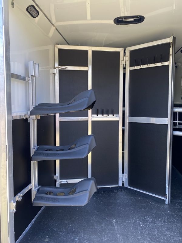 | Shadow 3 Horse Pro Series: 6'9" x 7'6" x 18', two slat side extrusion, tandem spring leaf axles, interlocking aluminum floor, escape door w/ drop feed window, fixed slant wall dressing room Picture shows swing wall, but fixed wall is standard, 30" dress, place for saddle racks if you need to move them from the back, bridle hooks, padded dividers, manual jack, drop feeds on head side, slider on butt side, rear tack with 50/50 rear doors, swing out saddle racks, roof vents, ceiling/upper wall lining/insulation, lower wall lining in horse area, interior/exterior horse ties, interior horse area lights on switch, load light on switch, fans, mats, spare.