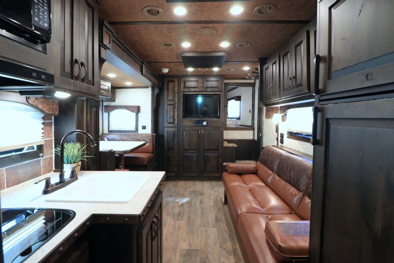 Model: 2026 Bloomer 5 Horse Overall Dimensions: 39'1'' L x 8' W x 7.5' H Configuration: 5+1 Horse Side Load FITS 6H Chassis: Triple HD 8k axles with hydraulic brakes for superior control and safety. Key Trailer Features: Wheels: 19.5'' Alcoa wheels paired with 18 Ply Continental tires for durability and smooth towing. Living Quarters: 15'9'' Trail Boss Conversion that comfortably sleeps 6, featuring a 78'' hydraulic slide-out Exterior: Charcoal skin, fully polished extruded sides, and a stainless steel front that offer both aesthetics and protection. Interior: Full back tack with a medicine cabinet, extensive shelving, and an integrated hay pod for optimal storage solutions. Luxury Living Quarters: Sofa and dinette convert to sleepers, alongside a fold-down bunk and a queen-sized mattress. Amenities: Equipped with an 5.5k Onan generator, dual hydraulic jacks, and a 18' electric awning with a protective shield. Kitchen and Bath: Features porcelain sinks, a stone backsplash, and a spacious bathroom with a marbled radius shower stall. Additional Features: Insulation: Fully insulated to maintain a comfortable interior climate regardless of external weather conditions. Accessibility: Features such as mangers, feed doorss, escape doors, and a walk-thru door into the LQ. Technology: 32 flat-screen TV with DVD, inside/outside speakers, and upgraded 4.5 interior lights to enhance your living experience. Measurements & Capacities: Length: 39'1'' Width: 8' Height: 7'6'' |