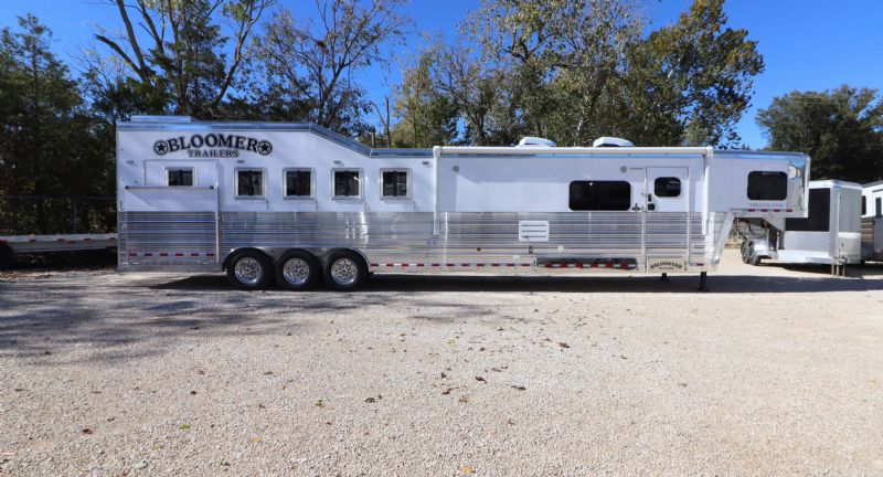 | New 2026 Bloomer 5.5 Horse with 15'9'' Trail Boss Living Quarters, Hydraulic Slide & Integrated Hay Pod. 2 AC's. Features a luxurious 15'9'' Trail Boss Conversion, 78'' hydraulic slide-out, and a versatile 5+1 slant load set up that hauls 6H. White exterior and fully polished aluminum frame to complete the upscale aesthetic.