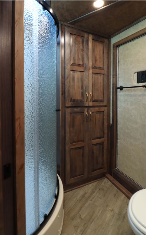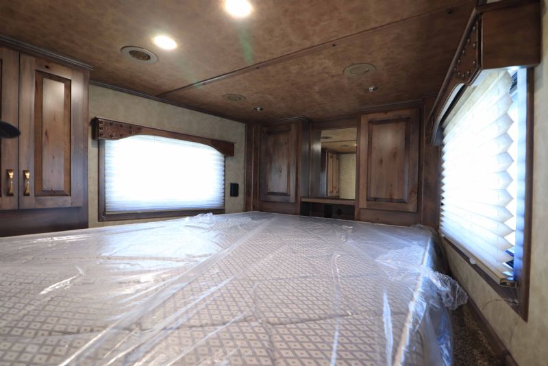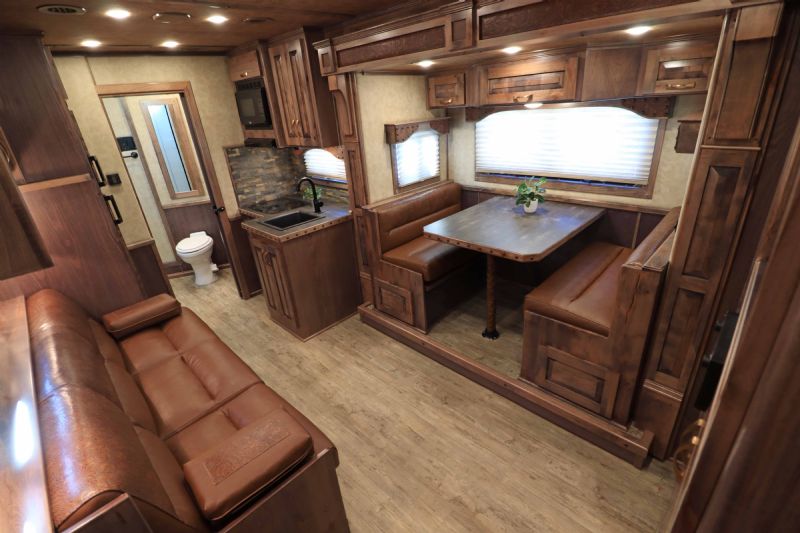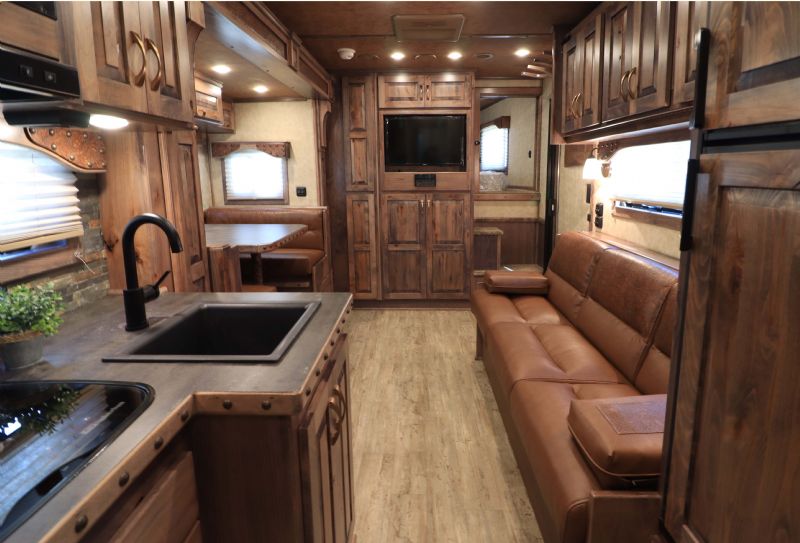 Overall Dimensions: 34'11'' L x 8' W x 7.5' H Configuration: 4 Horse Side Load with a Gooseneck Hitch Chassis: Triple HD 8k axles with hydraulic brakes for superior control and safety. Key Trailer Features: Wheels: 17.5 Alcoa wheels paired with 18 Ply Continental tires for durability and smooth towing. Living Quarters: 15' 9'' Trail Boss Conversion that comfortably sleeps 6, featuring a 77 hydraulic slide-out Exterior: White skin, fully polished extruded sides, and a stainless steel front that offer both aesthetics and protection. Interior: Full back tack with a medicine cabinet, extensive shelving, and an integrated hay pod for optimal storage solutions. Luxury Living Quarters: Comfort: Sofa and dinette convert to sleepers, alongside a fold-down bunk and a queen-sized mattress. Amenities: Equipped with 4k Onan generator, dual hydraulic jacks, and a 19' electric awning with a protective shield. Kitchen and Bath: Features porcelain sinks, a stone backsplash, upgraded German Beech cabinets, and a spacious bathroom with a marbled radius shower stall. Additional Features: Insulation: Fully insulated to maintain a comfortable interior climate regardless of external weather conditions. Accessibility: Features such as mangers with integrated feed doors, escape doors, and a walk-thru door into the LQ for easy movement throughout the trailer. Technology: 32 flat-screen TV with DVD, inside/outside speakers, and upgraded 4.5 interior lights to enhance your living experience. Measurements & Capacities: Length: 34'11'' Width: 8' Height: 7' 6'' |