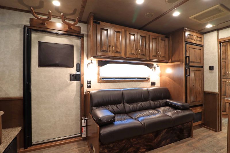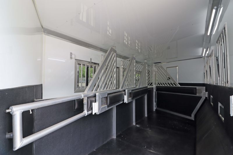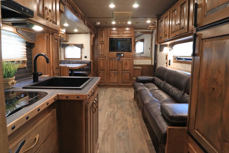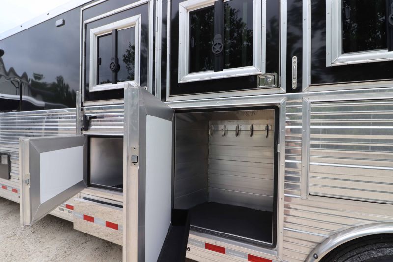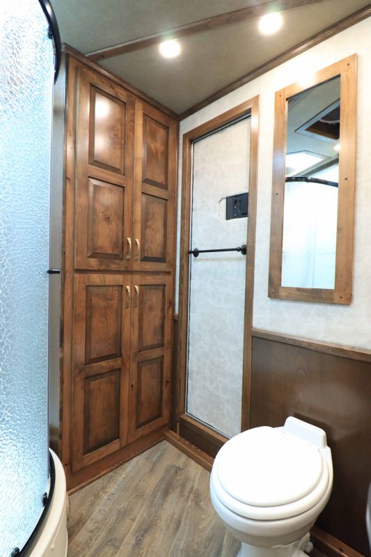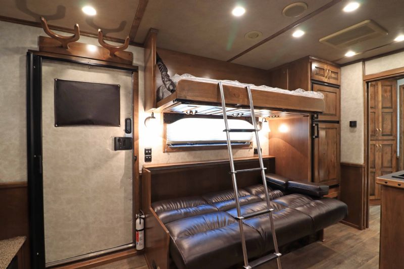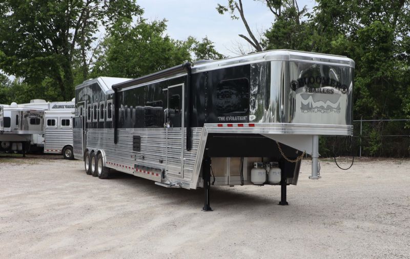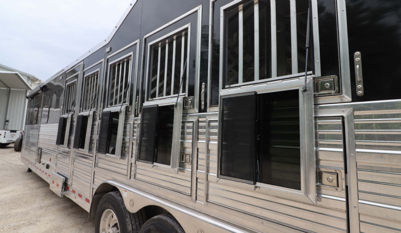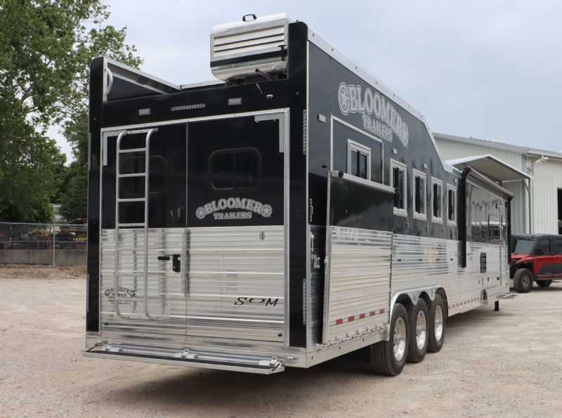 | Very well equipped 5-6 Horse Bloomer available. Trailer Features: PC Load, 5+1 set up, 5H w/XL 60'' rear stall that hauls an extra horse, 39' 1" floor, 8' wide by 7.5" tall, Three 8k axles with hydraulic disc brakes, 77" slide room, 19.5" Alcoa wheels Continental tires, Integrated hay pod, Dual hydraulic jacks, Full back tack with medicine cabinet & tons of shelving, Fully insulated, Drops front and back, Swing style feed doors on headside, European frame-less windows, Mangers under 4 stalls, Escape door w/integrated manger in first stall, Stud divider, Escape door, Walk thru door into LQ, Fully polished extruded sides, Stainless steel front. LQ Features: 15' 9'' Trail Boss Conversion, Sleeps 5-6 comfortably! 77" slide out, 5500w Onan generator, 2 AC units, 18' Electric awning w/shield, Genuine leather designer valances, Genuine leather accents and sofa yokes, Solid wood cabinets and moldings, Tile back splash, Upgraded slide room facia & trim, Sofa & Dinette sleepers, Fold down bunk, Queen mattress, Upgraded 4.5'' LED interior lights, Ducted 15k AC unit, 6.0 Fridge, Porcelain sinks, Pocket door into bath, Pocket sliding screen door, Wooden hat racks, 32" Flat screen TV w/DVD, Inside/outside speakers, Large bathroom with marbled radius shower stall, Vanity & 2 floor to ceiling wardrobe closets. Call Dave for more info, 314-498-9891 or email dave@somtrailers.com Trades, Financing and Free Limited Delivery are available! |