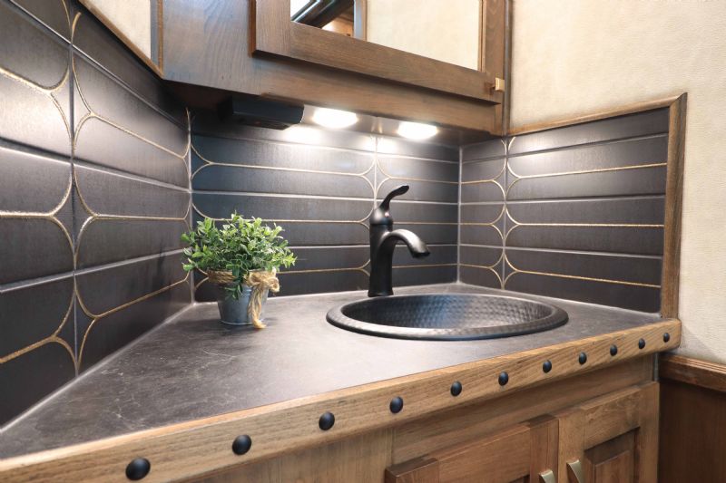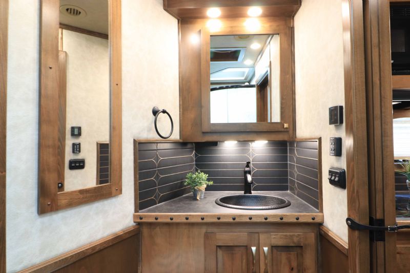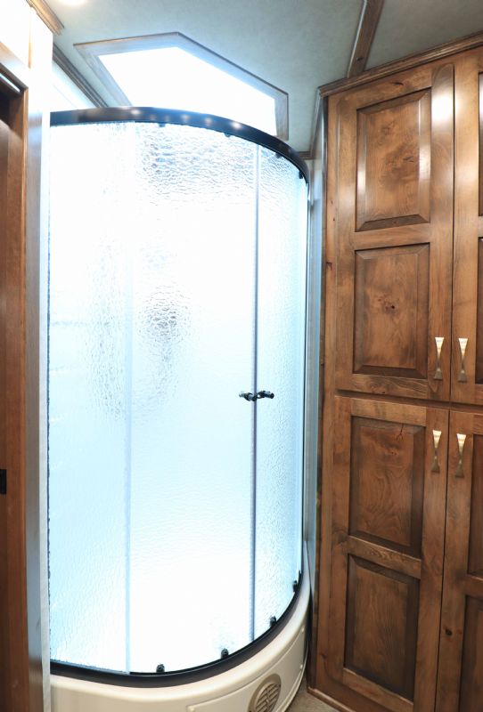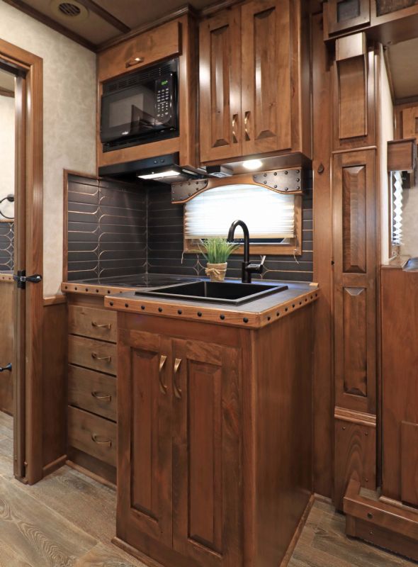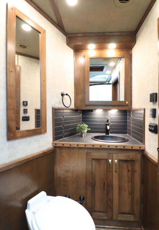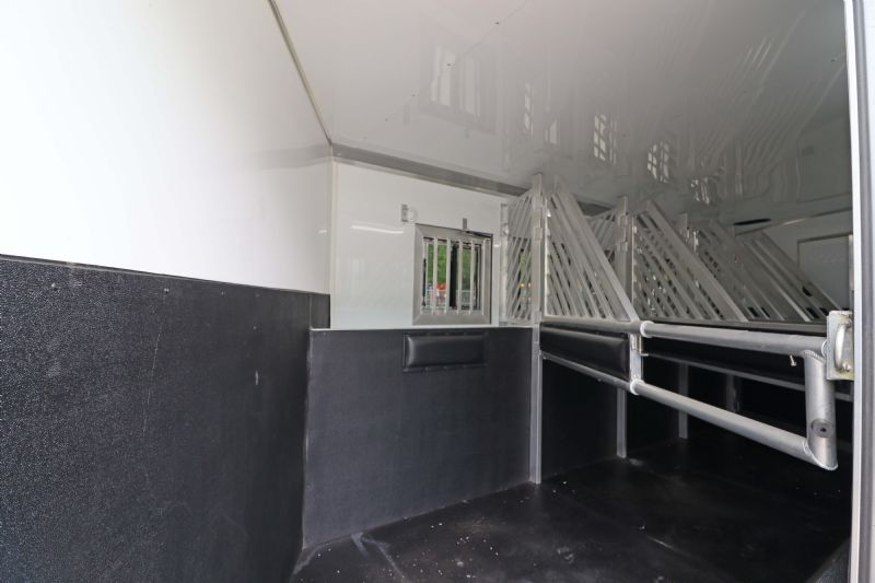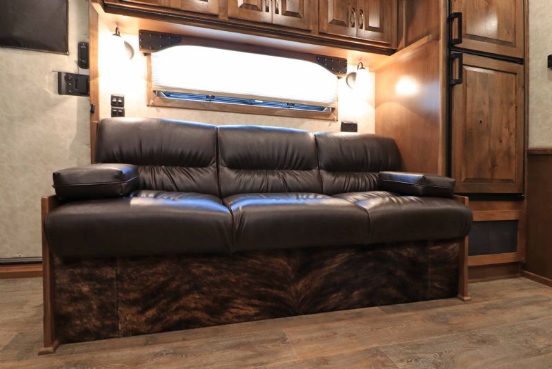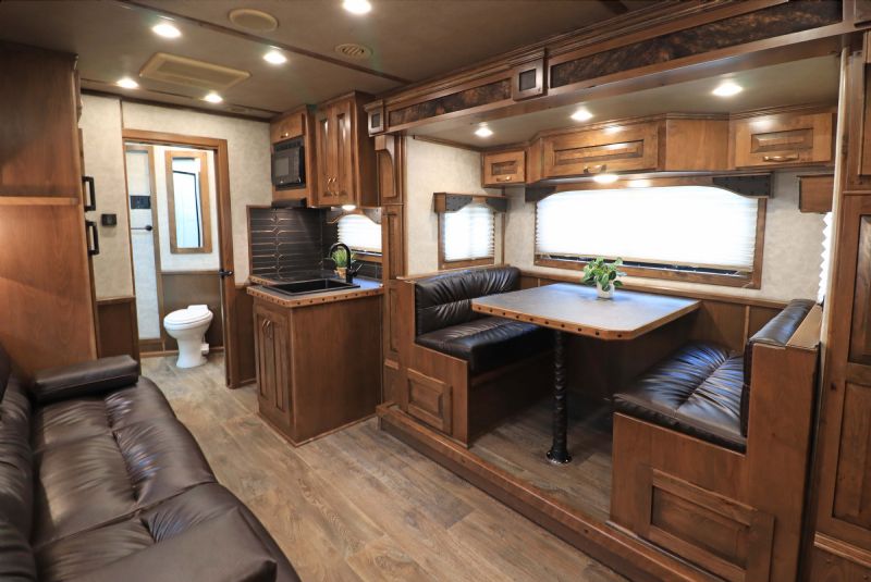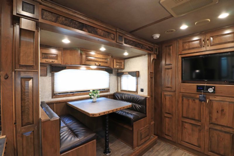 | Very well equipped 5-6 Horse Bloomer available. Trailer Features: PC Load, 5+1 set up, 5H w/XL 60'' rear stall that hauls an extra horse, 39' 1" floor, 8' wide by 7.5" tall, Three 8k axles with hydraulic disc brakes, 77" slide room, 19.5" Alcoa wheels Continental tires, Integrated hay pod, Dual hydraulic jacks, Full back tack with medicine cabinet & tons of shelving, Fully insulated, Drops front and back, Swing style feed doors on headside, European frame-less windows, Mangers under 4 stalls, Escape door w/integrated manger in first stall, Stud divider, Escape door, Walk thru door into LQ, Fully polished extruded sides, Stainless steel front. LQ Features: 15' 9'' Trail Boss Conversion, Sleeps 5-6 comfortably! 77" slide out, 5500w Onan generator, 2 AC units, 18' Electric awning w/shield, Genuine leather designer valances, Genuine leather accents and sofa yokes, Solid wood cabinets and moldings, Tile back splash, Upgraded slide room facia & trim, Sofa & Dinette sleepers, Fold down bunk, Queen mattress, Upgraded 4.5'' LED interior lights, Ducted 15k AC unit, 6.0 Fridge, Porcelain sinks, Pocket door into bath, Pocket sliding screen door, Wooden hat racks, 32" Flat screen TV w/DVD, Inside/outside speakers, Large bathroom with marbled radius shower stall, Vanity & 2 floor to ceiling wardrobe closets. Call Dave for more info, 314-498-9891 or email dave@somtrailers.com Trades, Financing and Free Limited Delivery are available! |