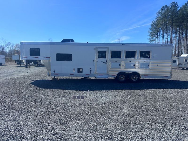 | 2026 Merhow Stampede 8410-A FK-NS, 10ft sw Full LQ, couch makes a bed with flip up console, big fridge, ducted AC, propane furnace, double sink, microwave, glass top two burner stove, added flip up counter, added decor fabric on couch and valances, soft touch walls, crown molding finished LQ, pocket bathroom door, plenty of storage cabinets, walk through door, done shower, double closets in the bathroom, sink and vanity, toilet, fantastic exhaust fan with rain sensor, power awning, indoor outdoor speakers, hydraulic Jack, tow propane tanks, spare, jiffy jack, lockable aluminum battery box, two batteries, escape door with added flip up step, three load lights one on each side including above the back door all with switches, lower divider, fully lined and insulated horse box, roof vents, air flow dividers with padding, fold up rear tack, manger storage, saddle rack, blanket bar, brush box, bridle hooks, added rear ramp, added sanity wash option to flush tanks easily, super nice trailer great size!! |